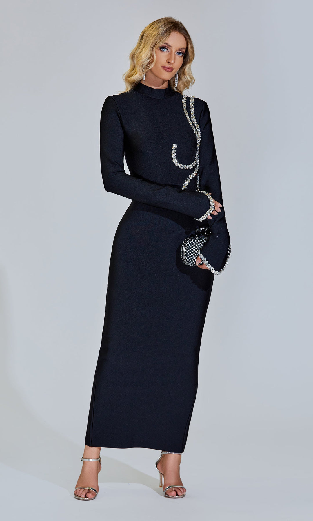 Zümrüt Siyah Uzun Kollu Uzun Elbise