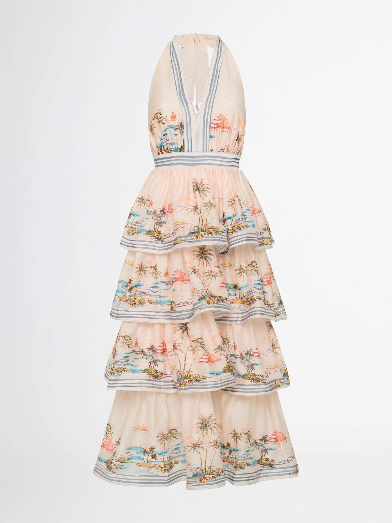 Alma Manzara Baskılı Katlı Boyundan Bağlı Uzun Elbise