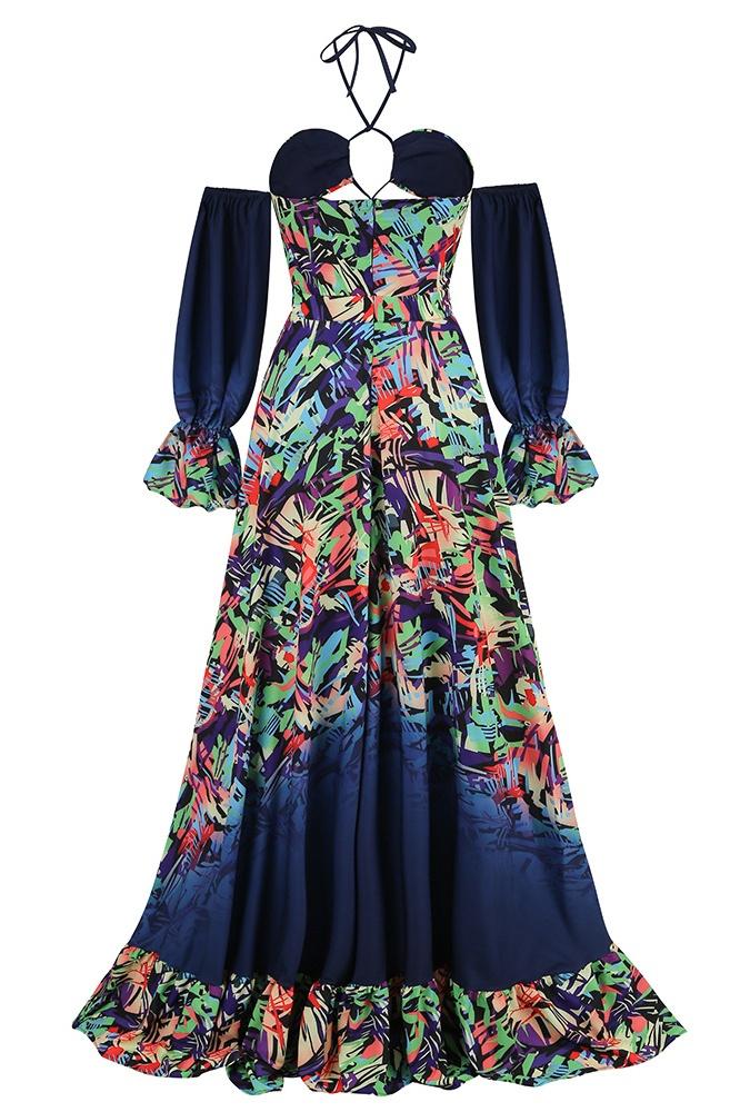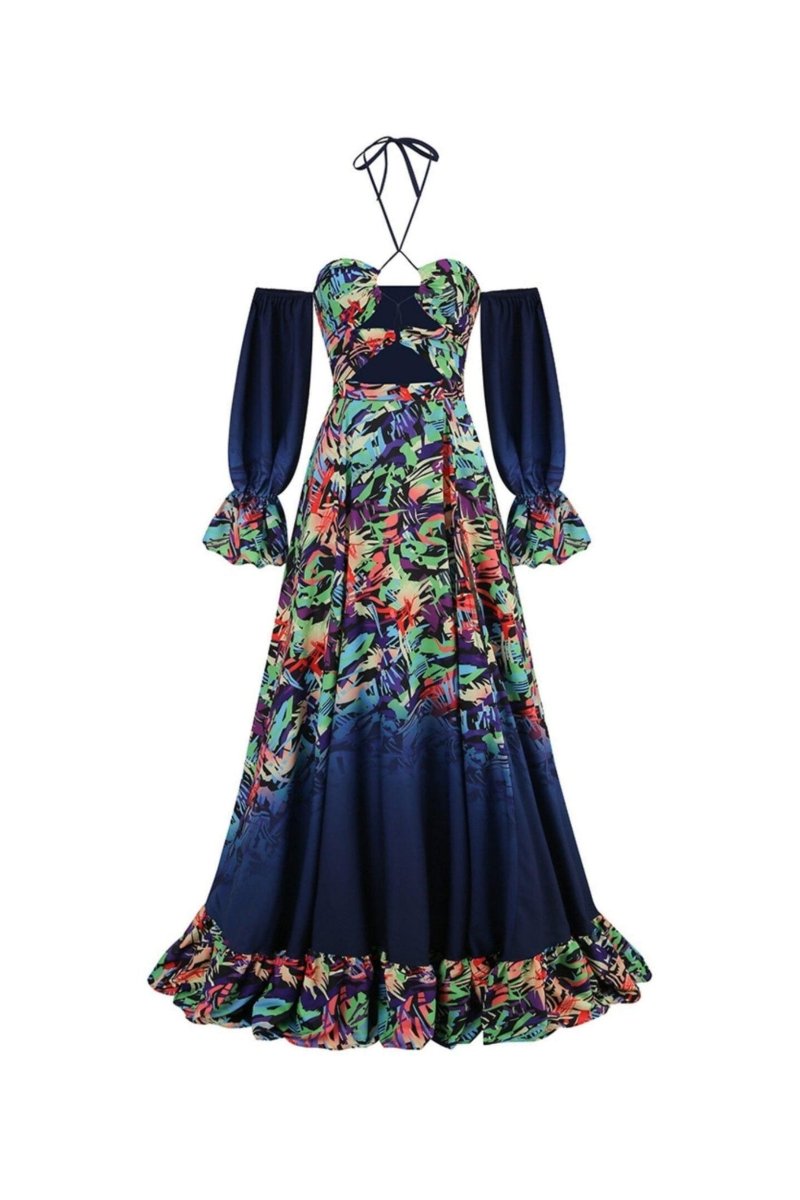 Astrid Baskılı Boyundan Bağlamalı Uzun Elbise