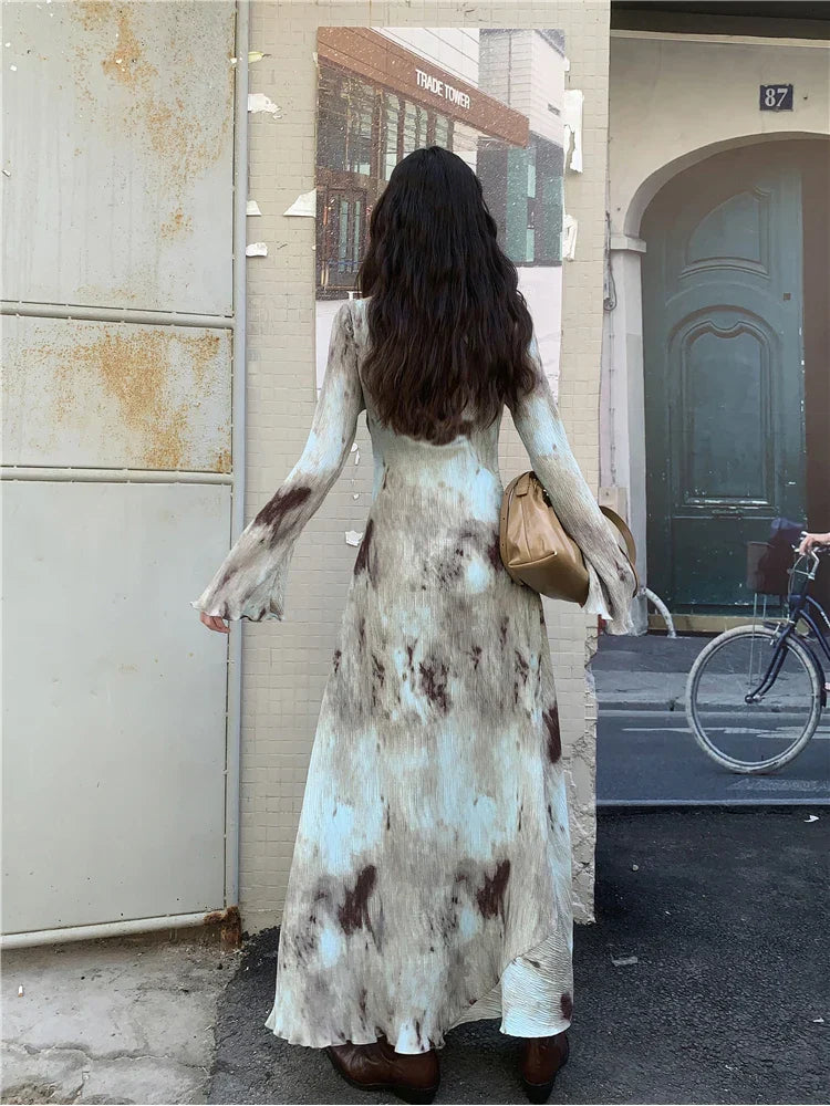 Cherr Mermer Desen Sırt Dekolte Uzun Kollu Maxi Elbise