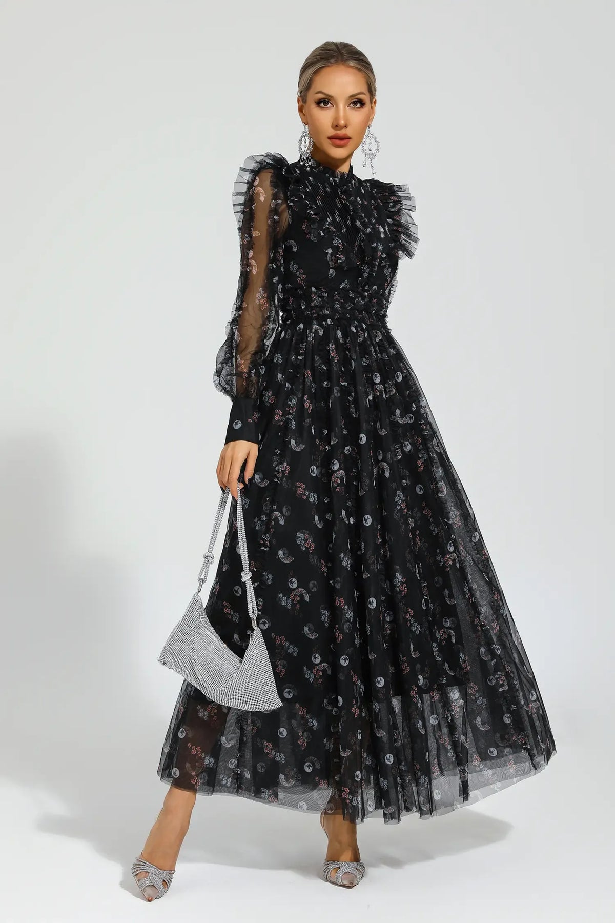 Elara Siyah Çiçekli Uzun Kol Uzun Elbise