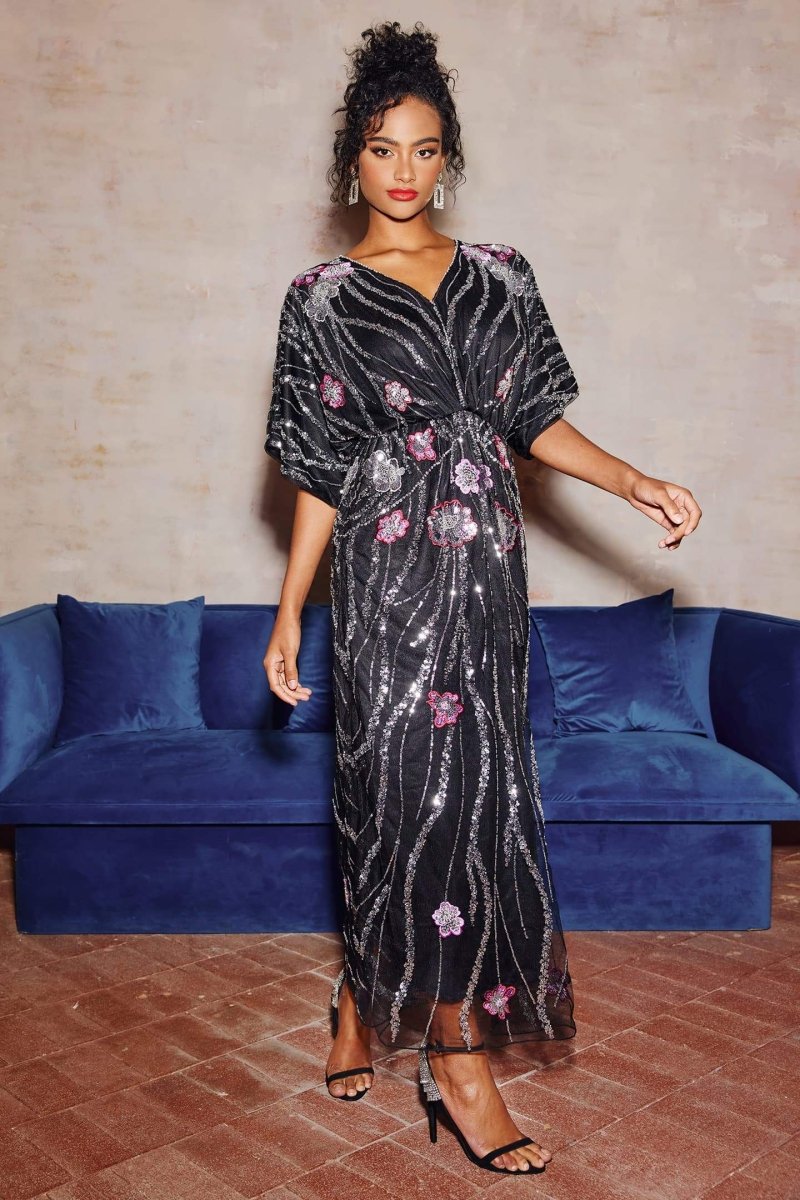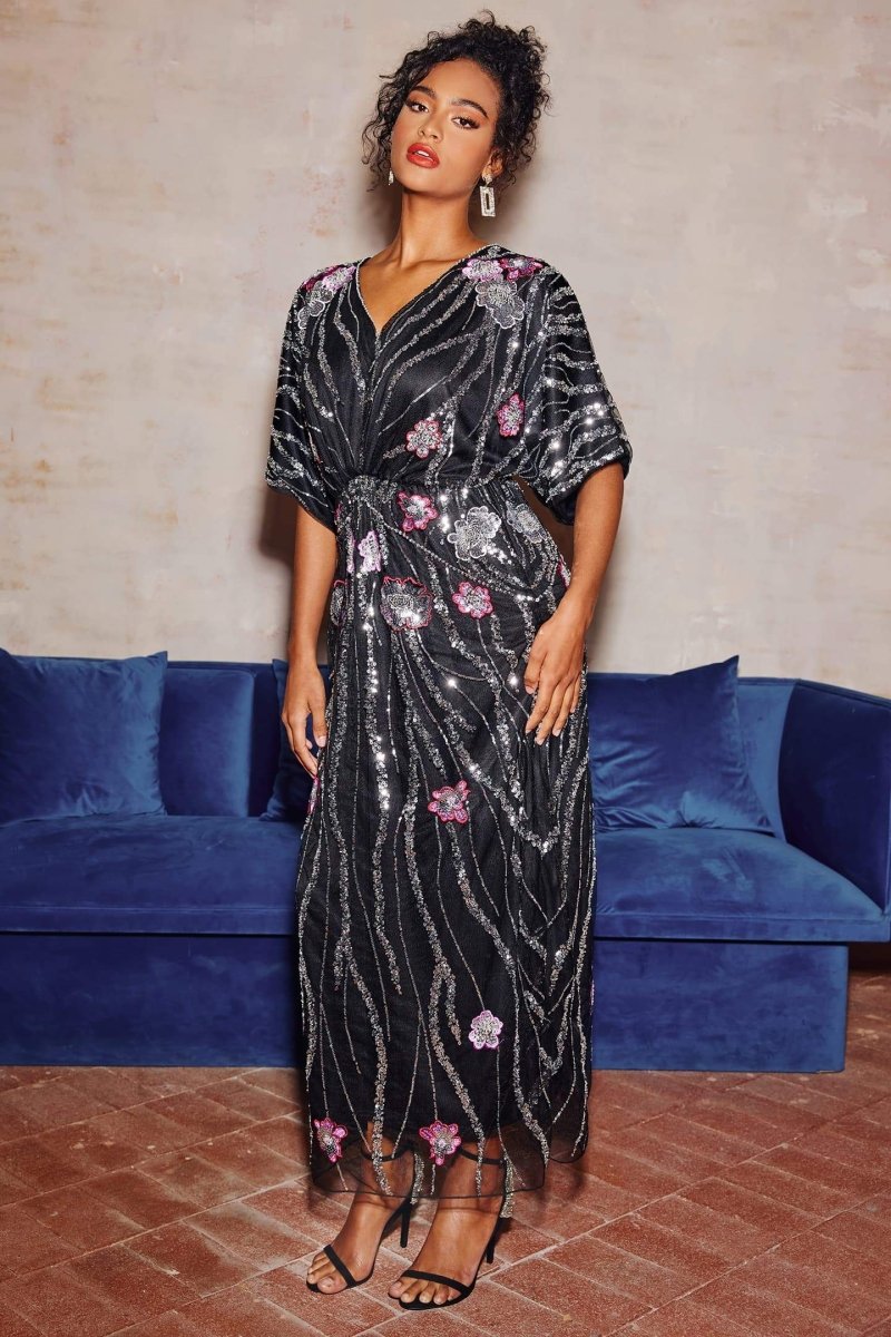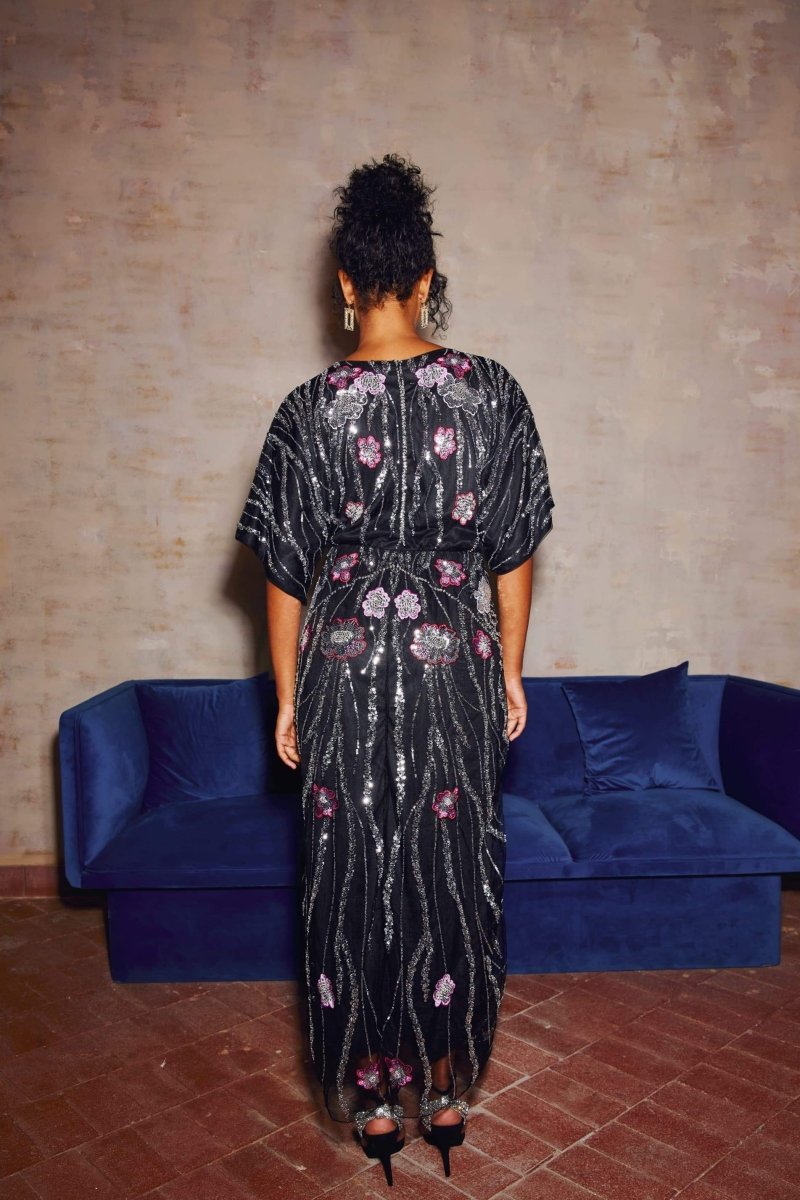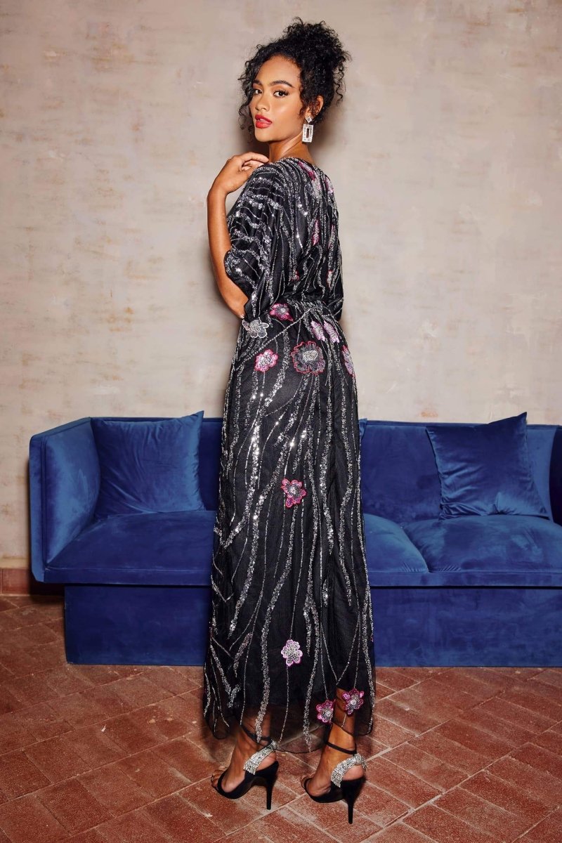 Nina Çiçek İşlemeli Payetler Maxi Elbise