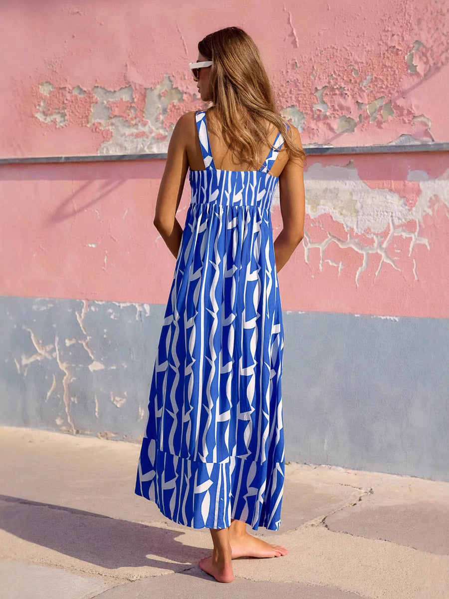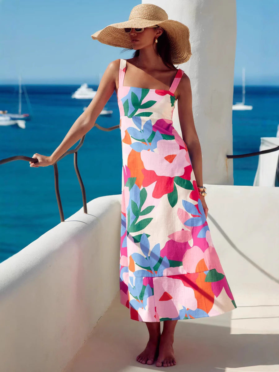 Bu yaza hazır Fransız esintili elbiseyle canlı ve şık bir görünümü benimseyin. Renkli, çoklu baskılı tasarıma sahip askılı, akıcı silüet, tatil havası yayar; sıcak havalarda geziler veya deniz kenarında kaçamaklar için mükemmeldir.