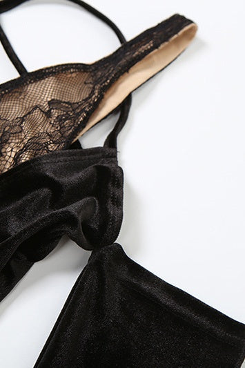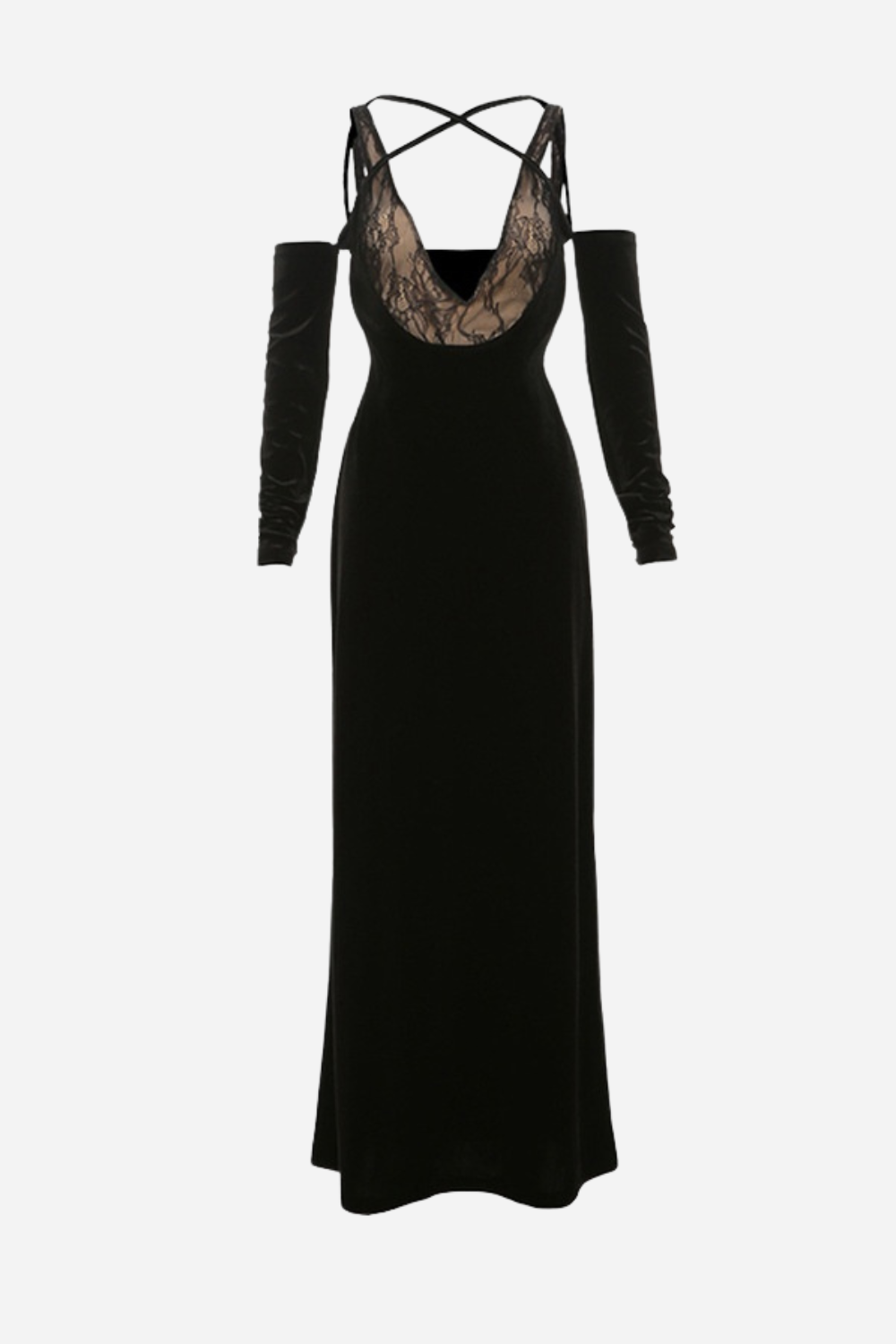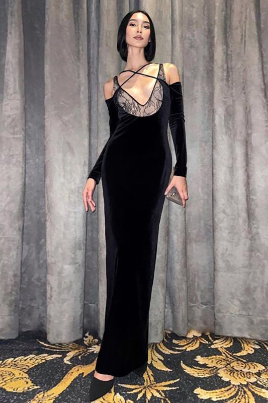 V Yaka Dantelli Kadife Eldiven Maxi Elbise