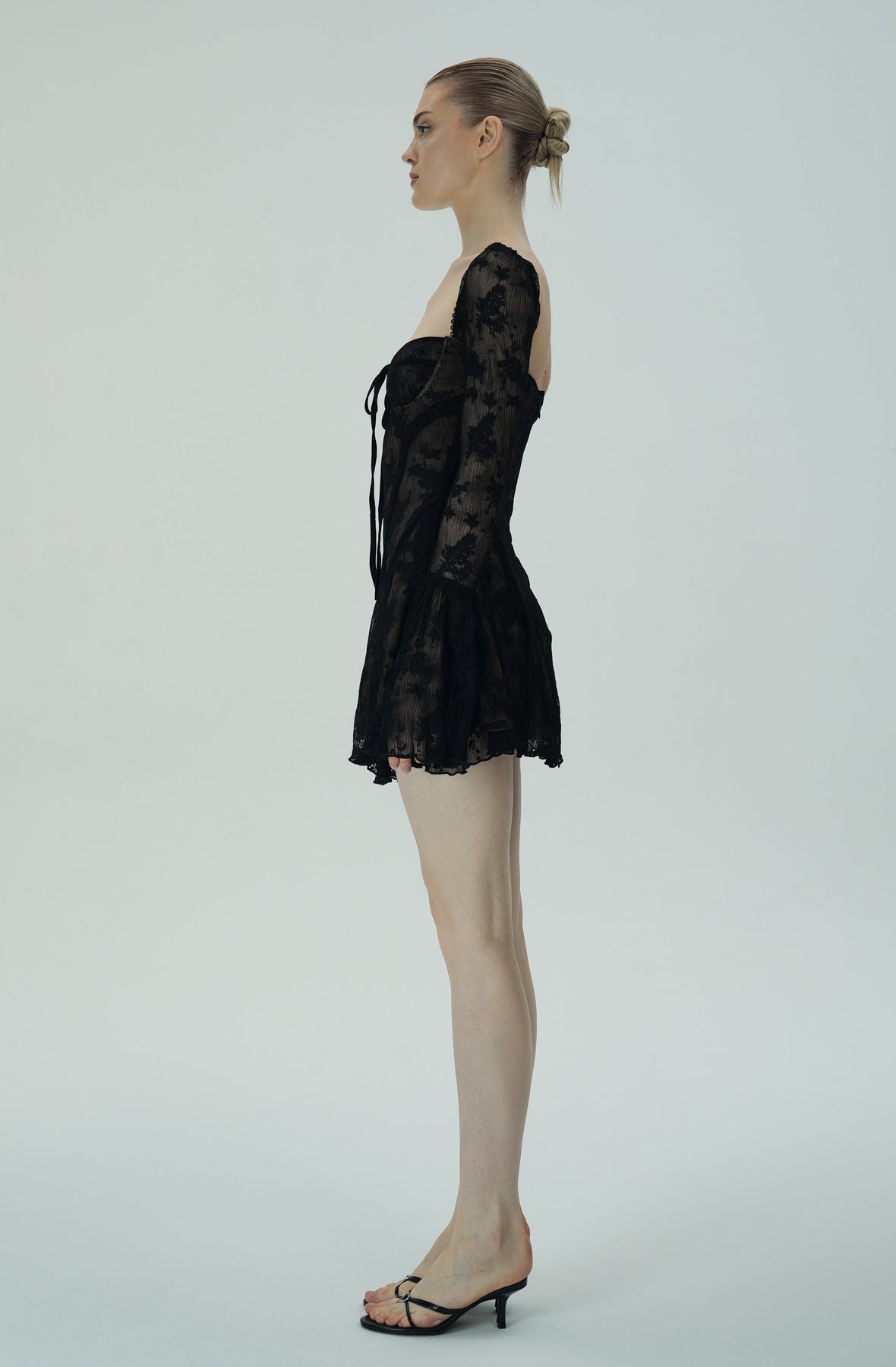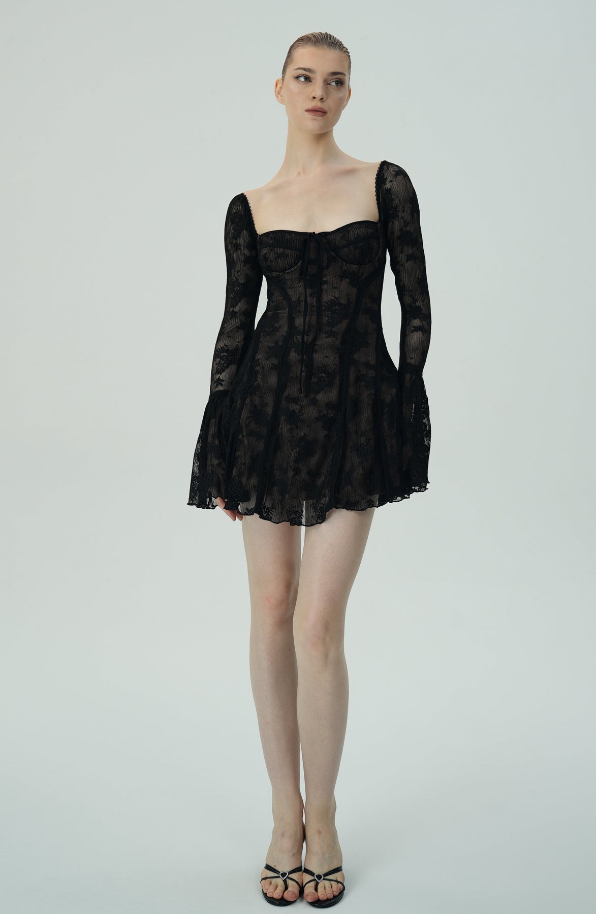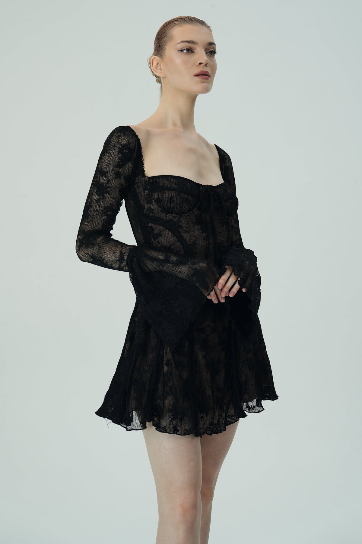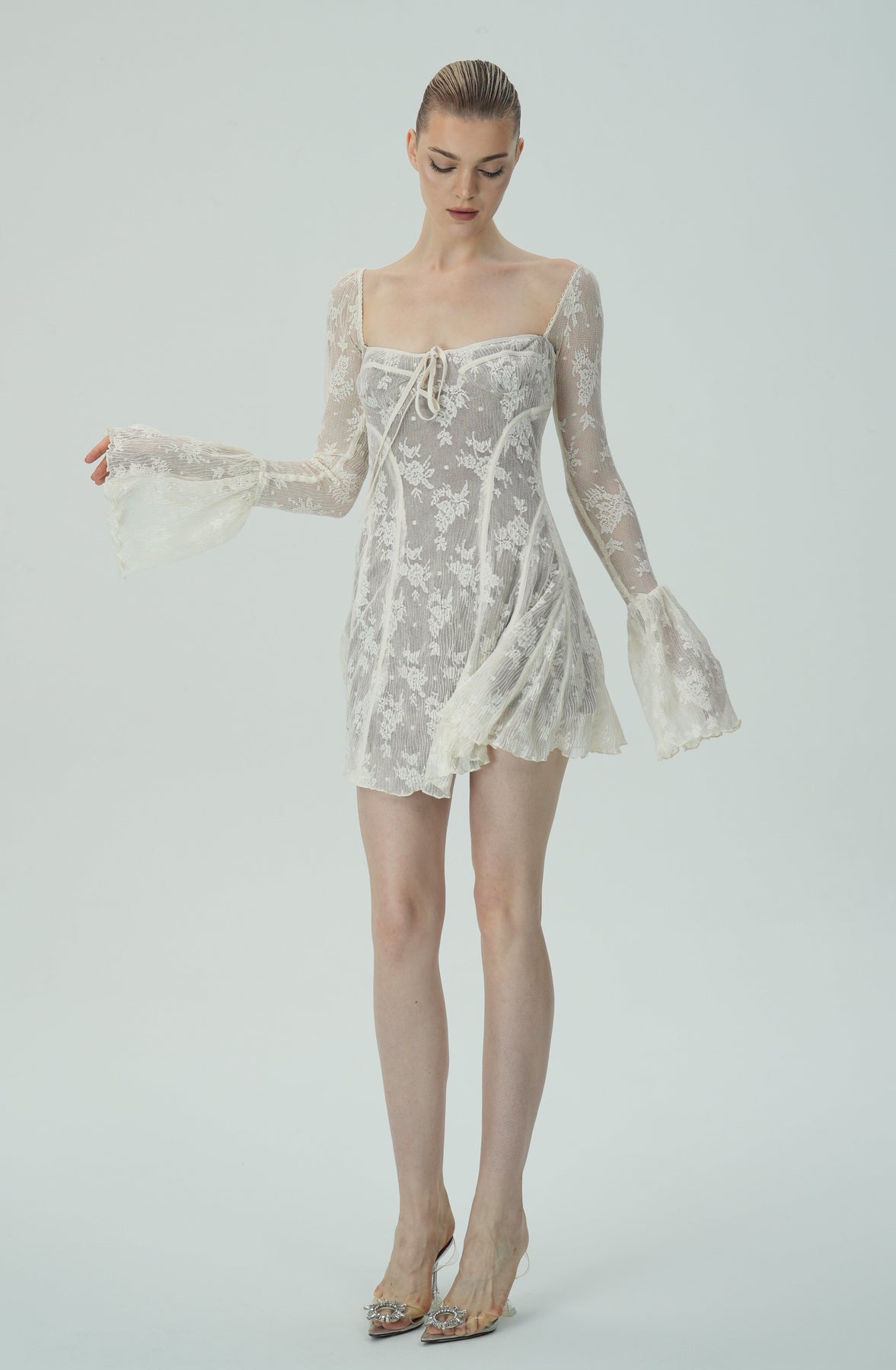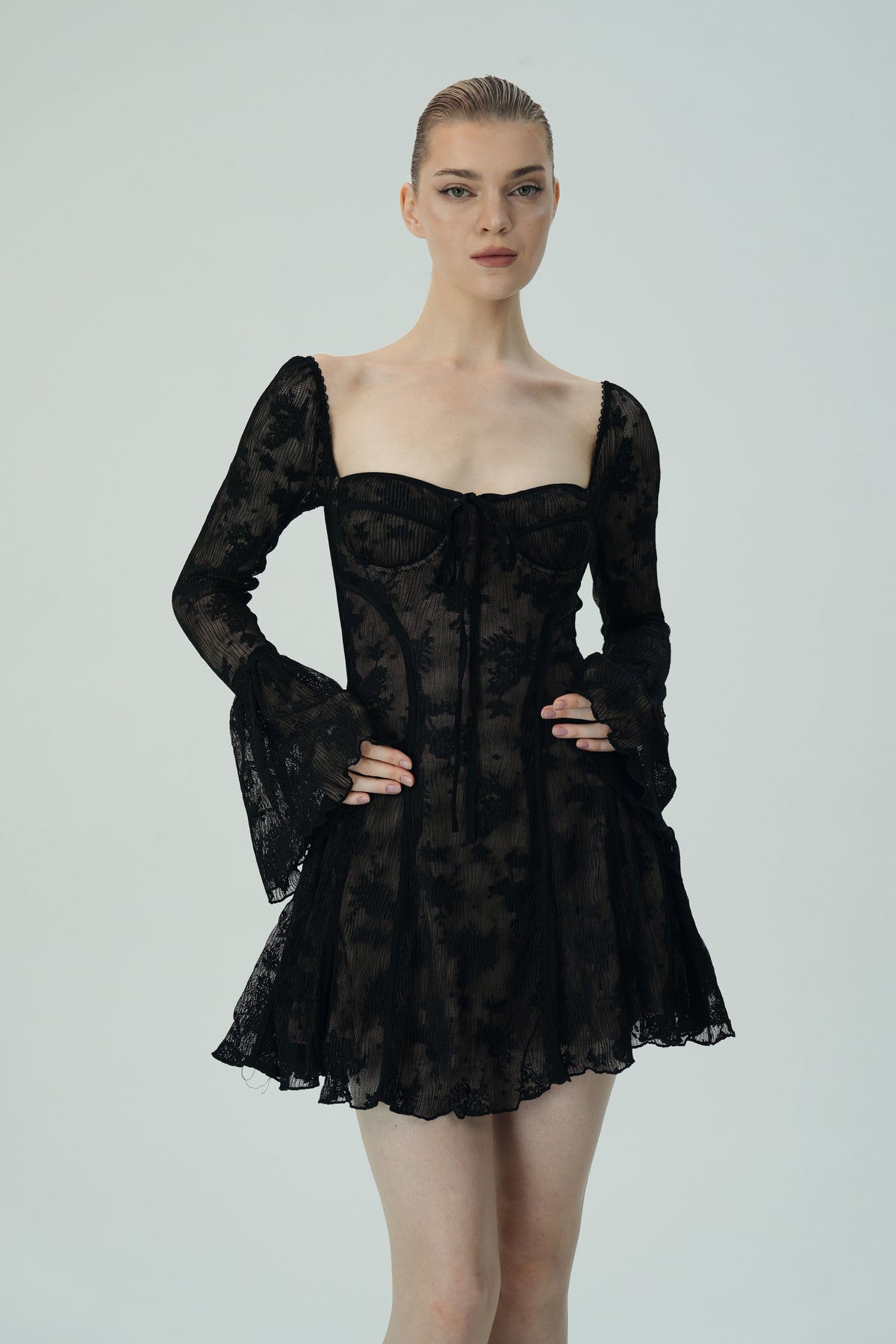Bu zarif mini elbise, detaylı dantel kumaşı, hareketli çan kolları ve ön bağcık detayıyla feminen ve modern bir stil sunuyor. Beden oturan gövde kesimi beli vurgularken, A kesim eteği özgürce hareket etme imkanı tanır. Genç ve enerjik havasıyla hem günlük hem de özel günlerde rahatlıkla kullanılabilecek bir tasarım!