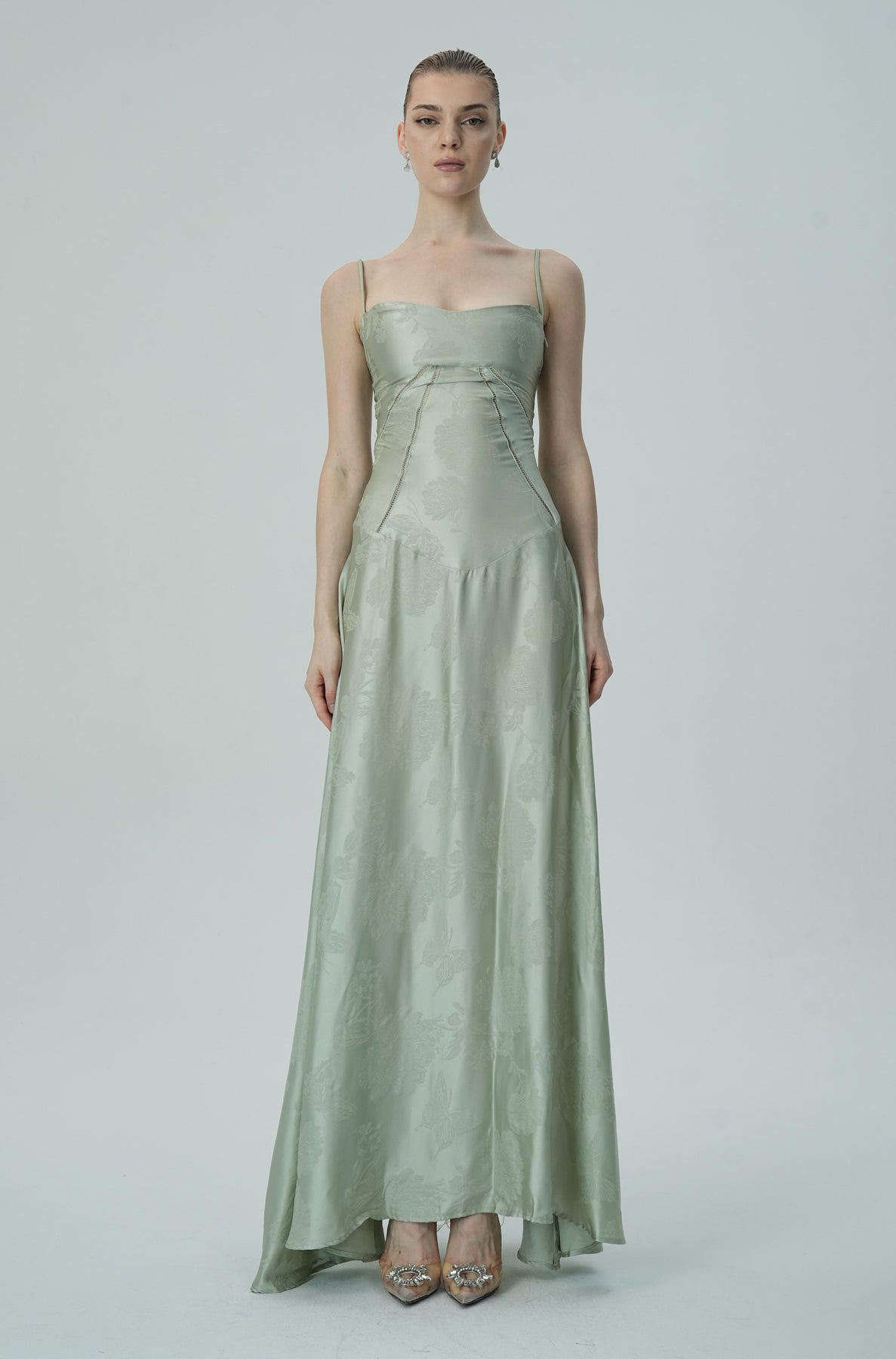 Bu göz alıcı lavanta rengi saten maxi elbise, zarif çiçek jakar deseni, ince askıları ve akıcı etek kesimiyle sofistike ve lüks bir görünüm sunuyor. Vücuda oturan korsaj üstü, figürü mükemmel bir şekilde tamamlayarak şık ve feminen bir siluet oluştururken, maxi boy eteği zarif ve akıcı bir hareket sağlar.