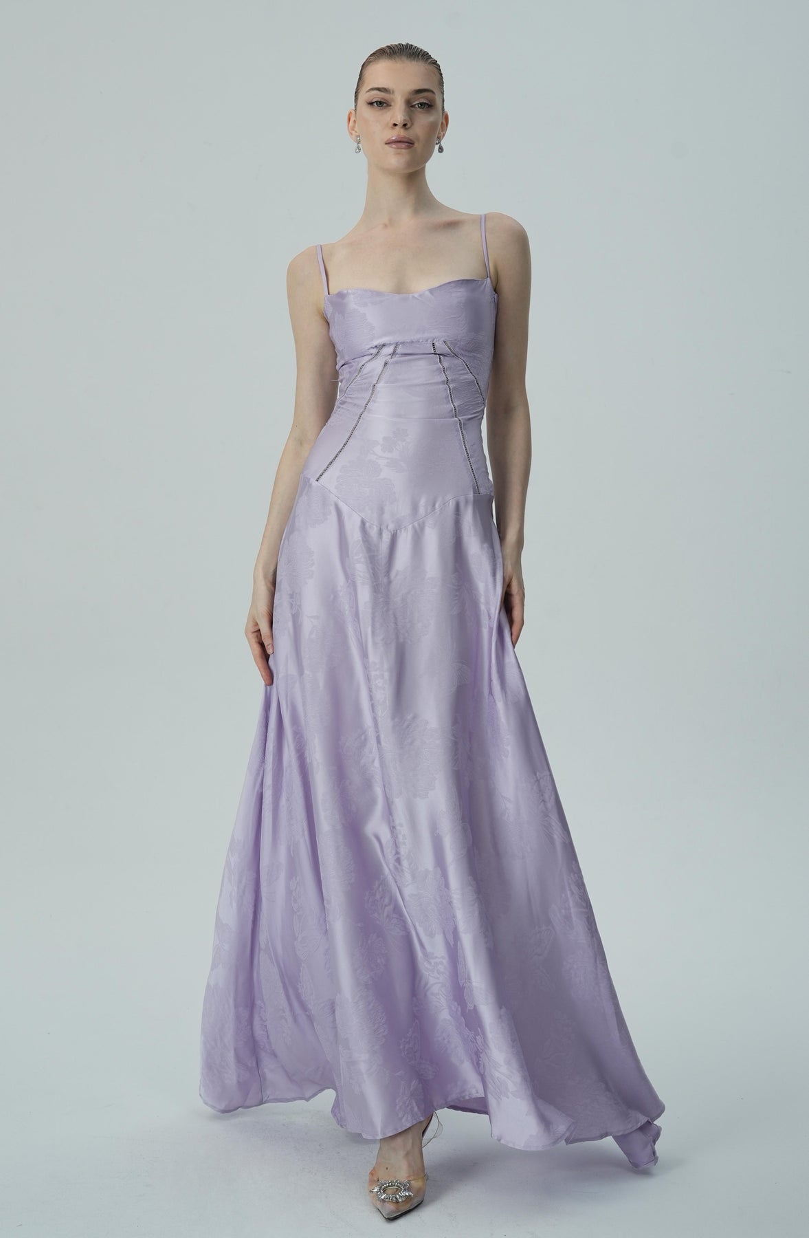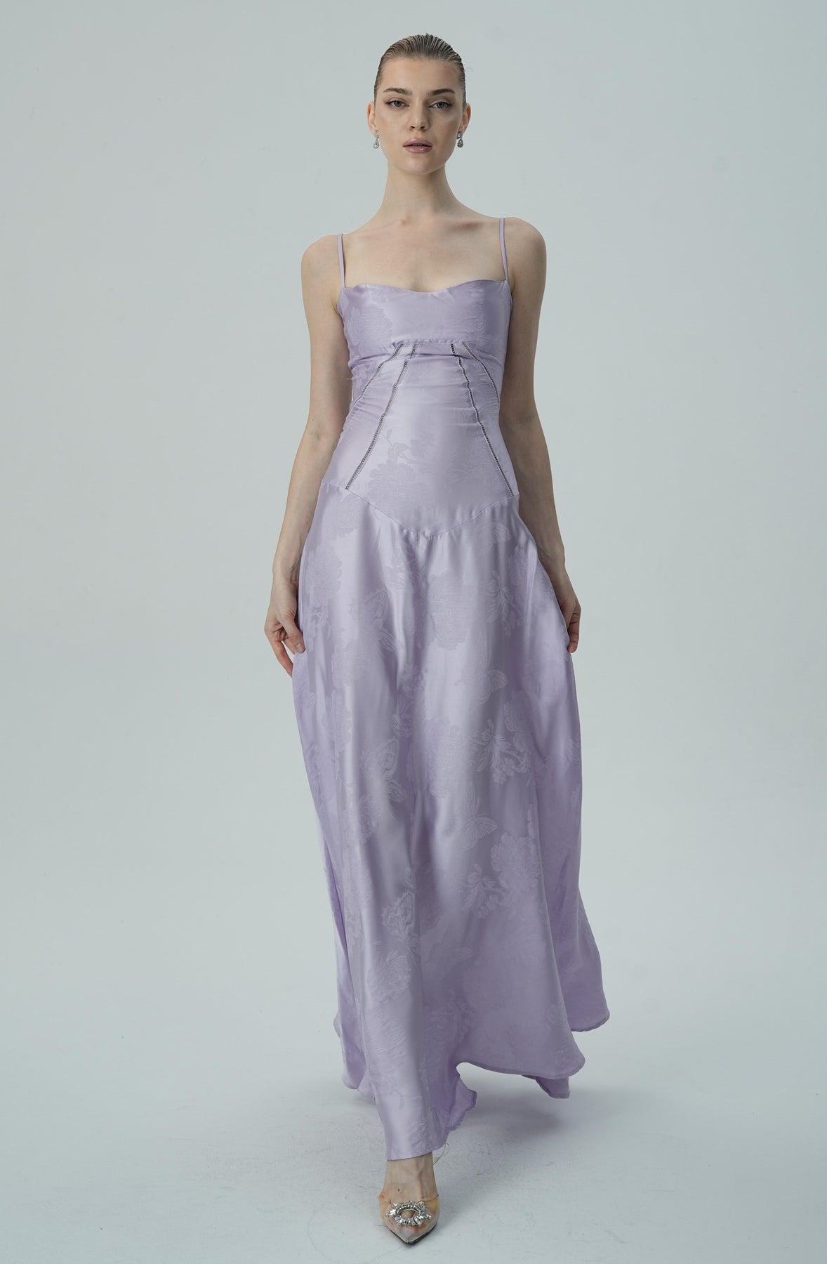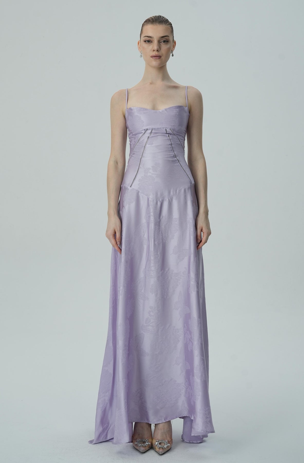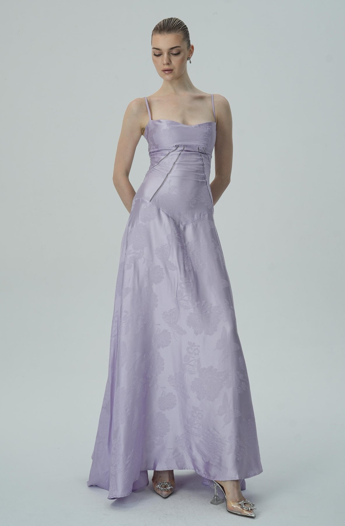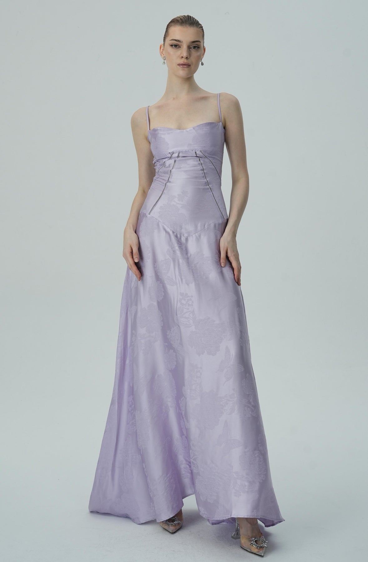 Lavanta Çiçekli Jakarlı Saten Maksi Elbise