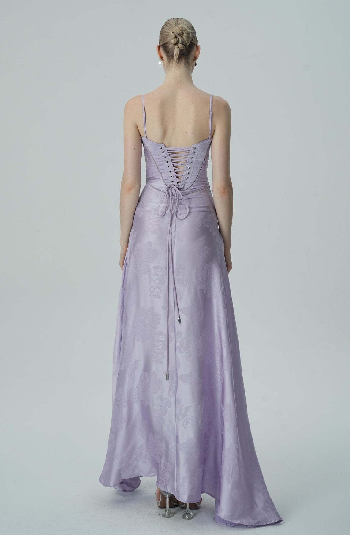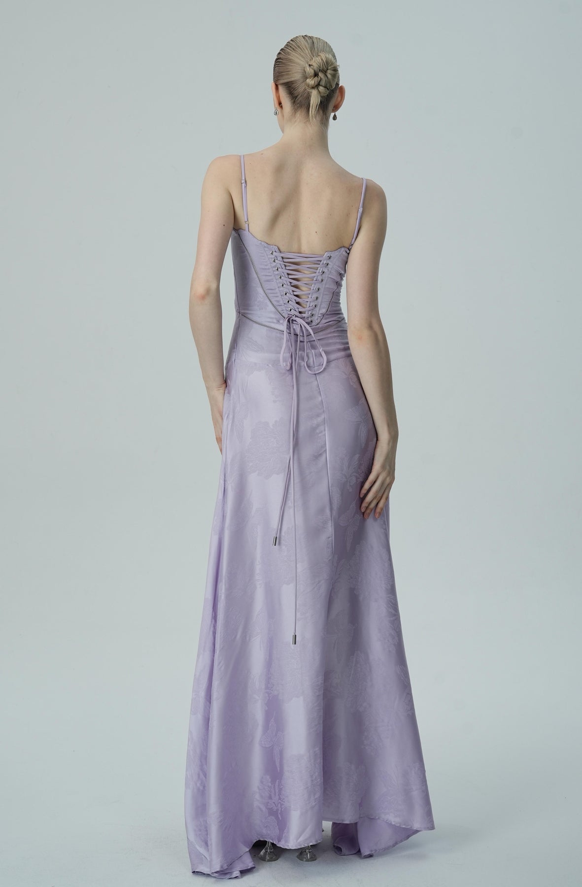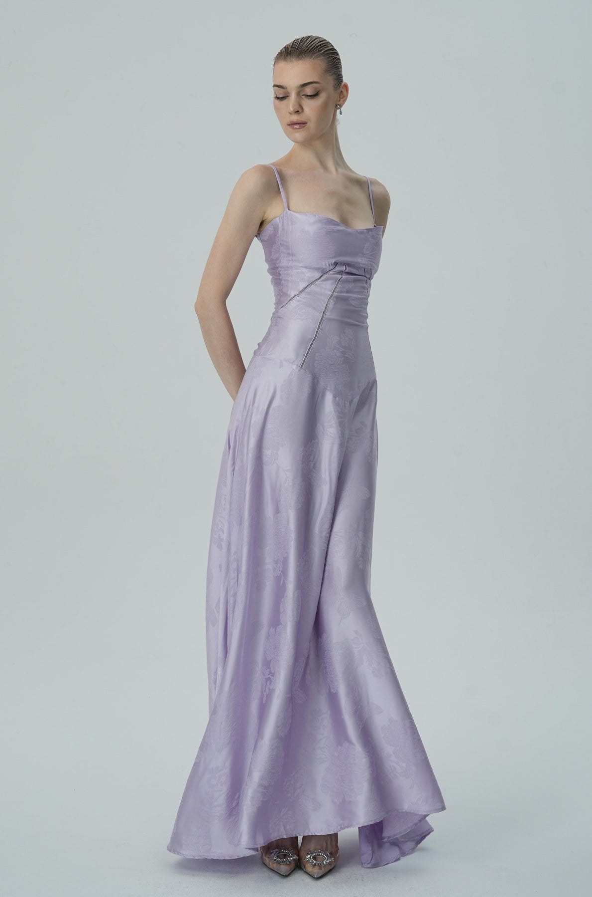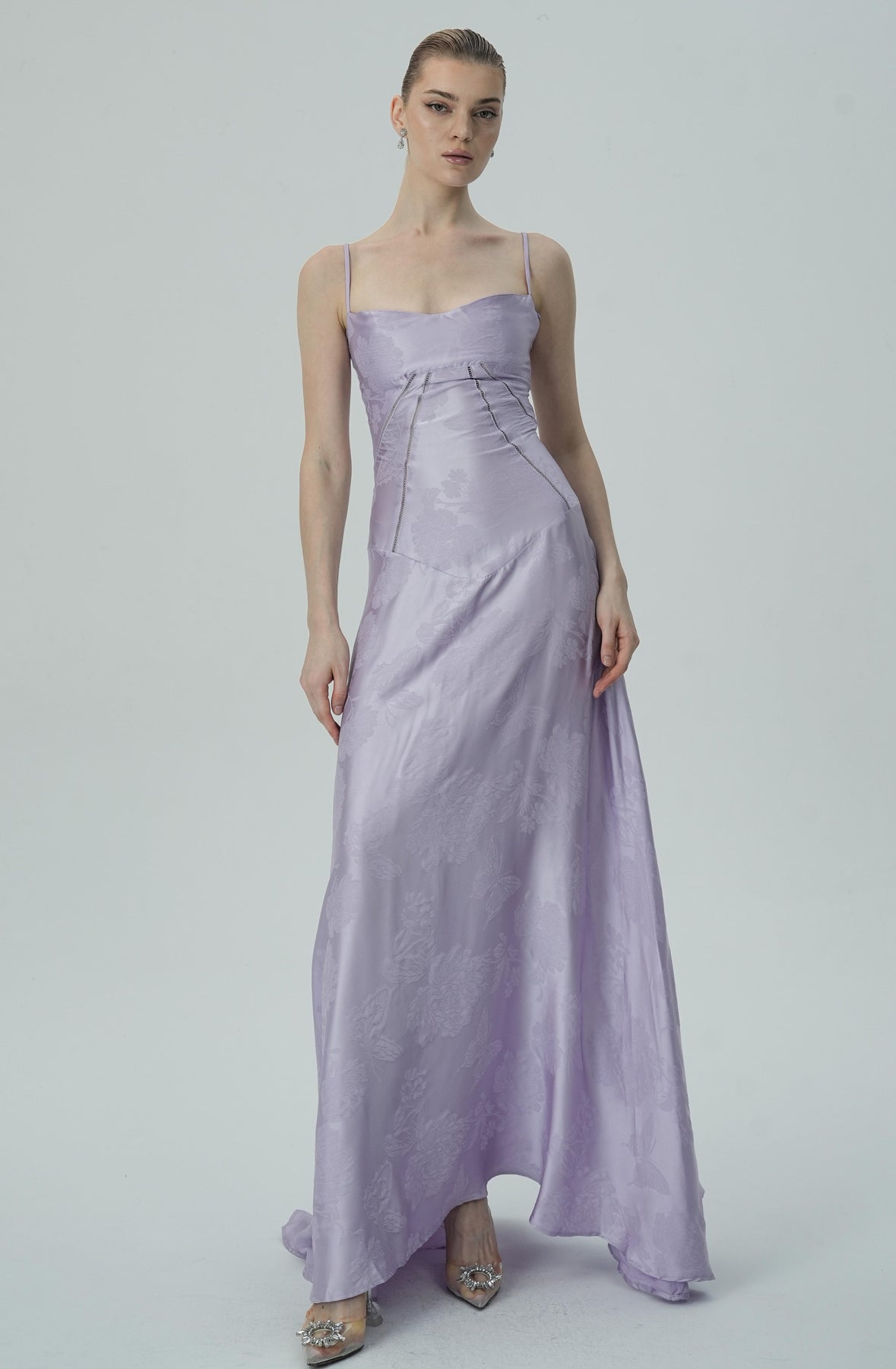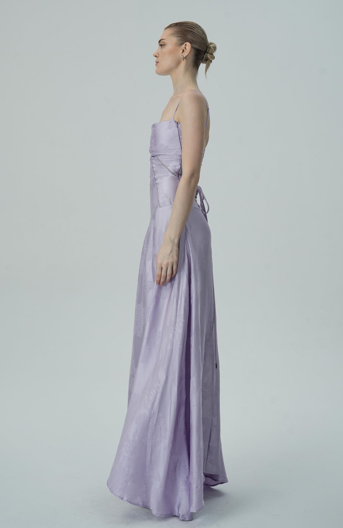 Lavanta Çiçekli Jakarlı Saten Maksi Elbise
