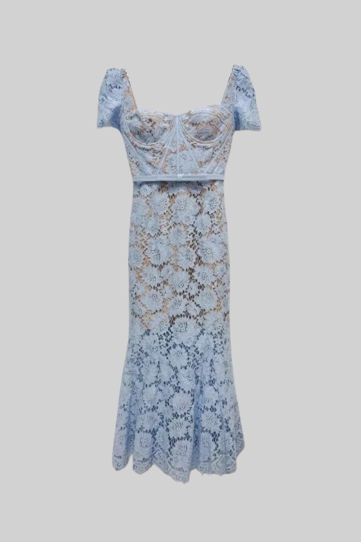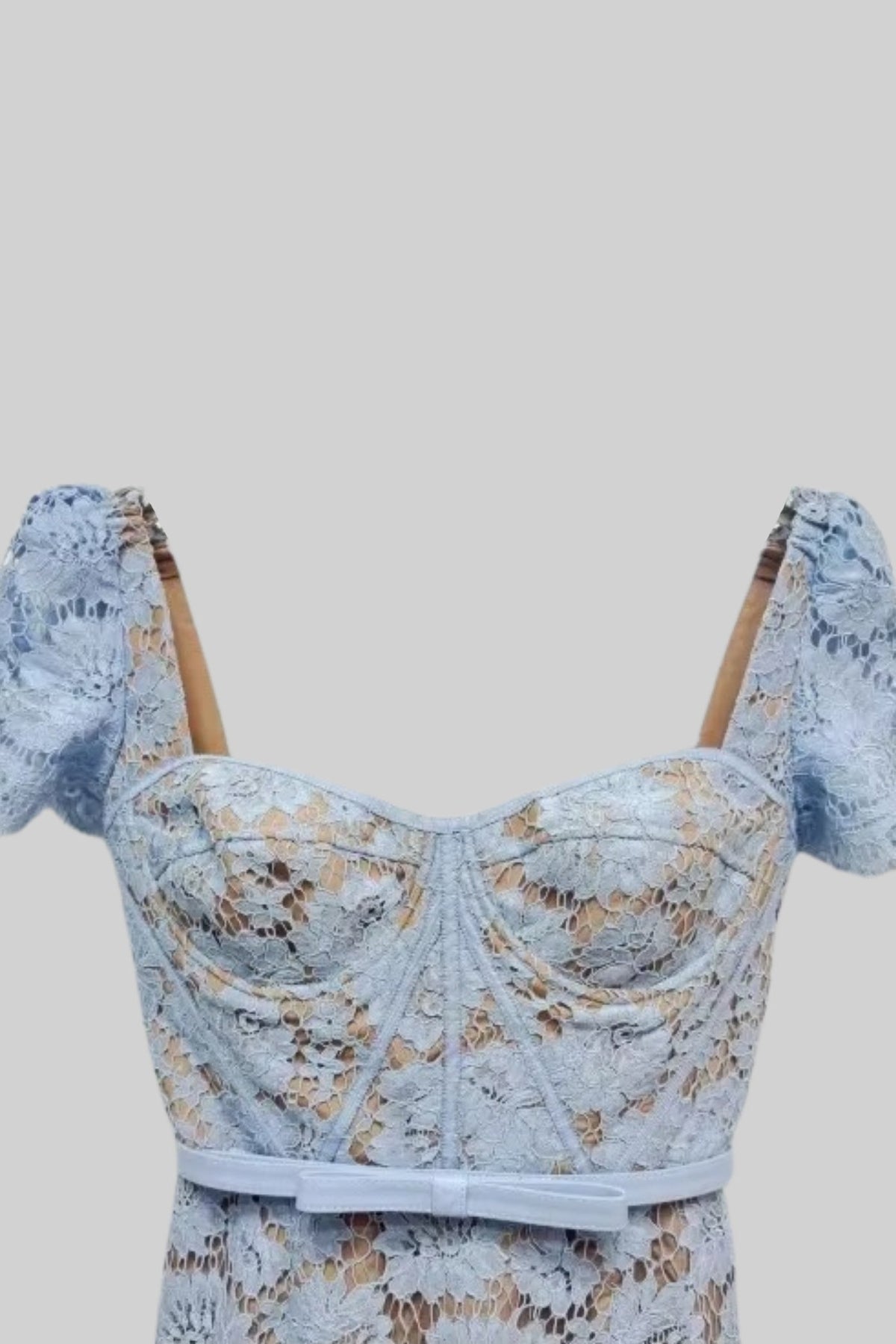Mavi Kısa Kollu Dantel Elbise, Uyumlu Bel Kemeri ile