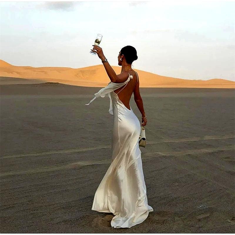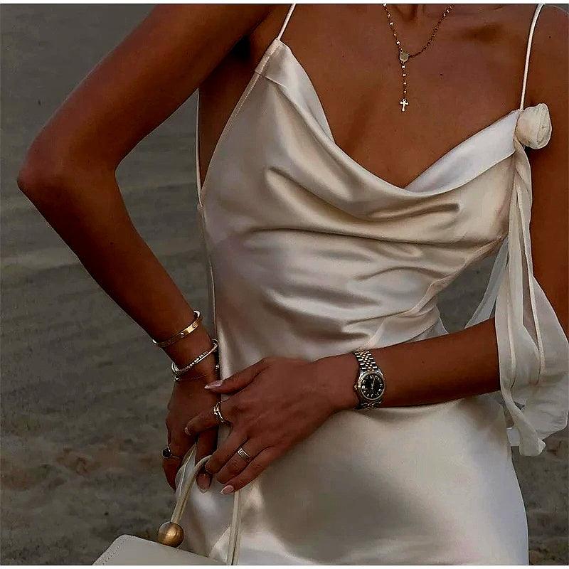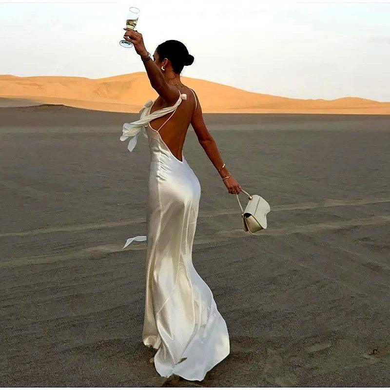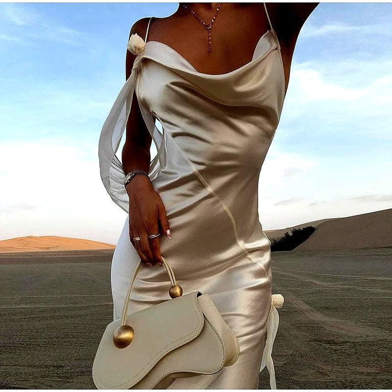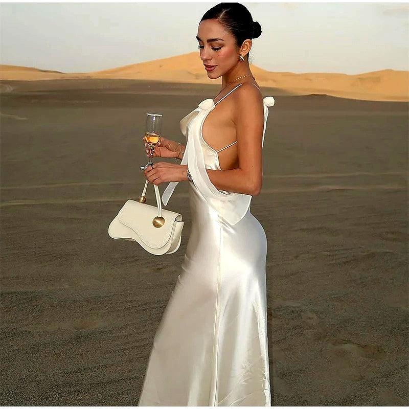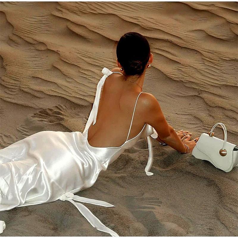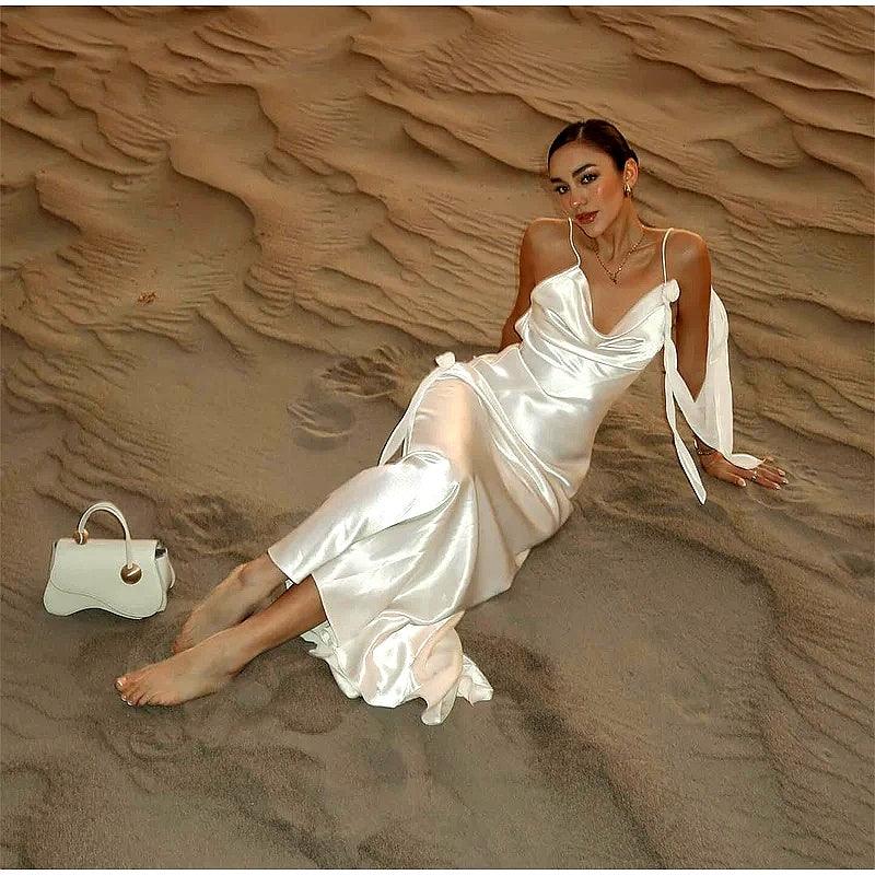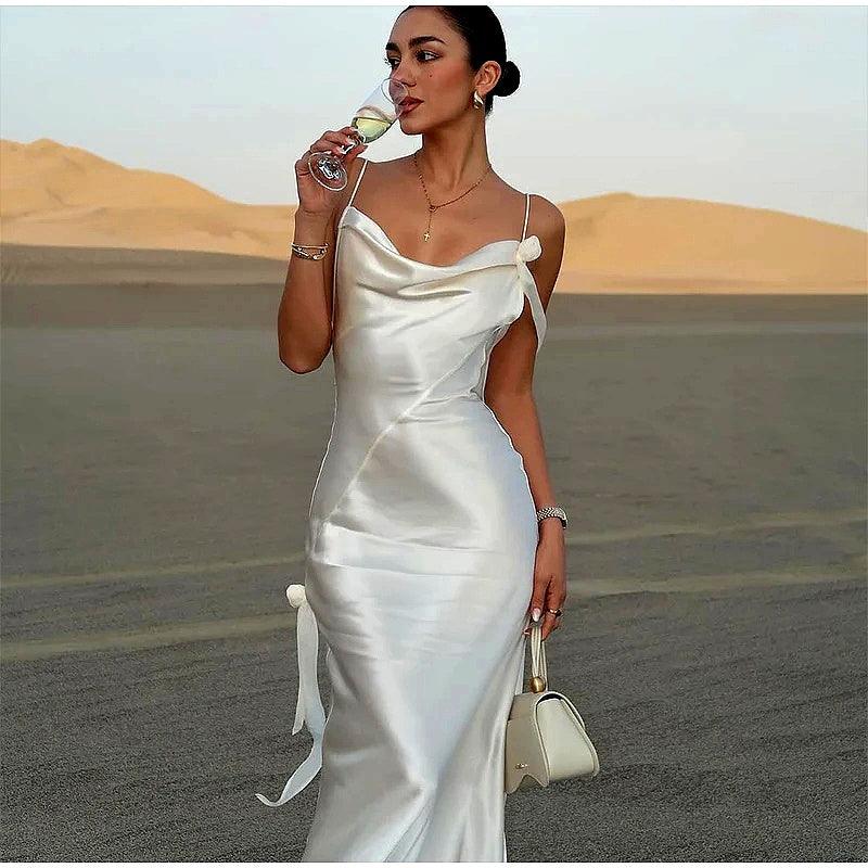 Akıcı saten dokusu ve zarif bağlama detaylarıyla dikkat çeken bu beyaz slip elbise, sofistike ve feminen bir stil sunuyor. Özel davetler ve romantik akşamlar için mükemmel bir tercih!