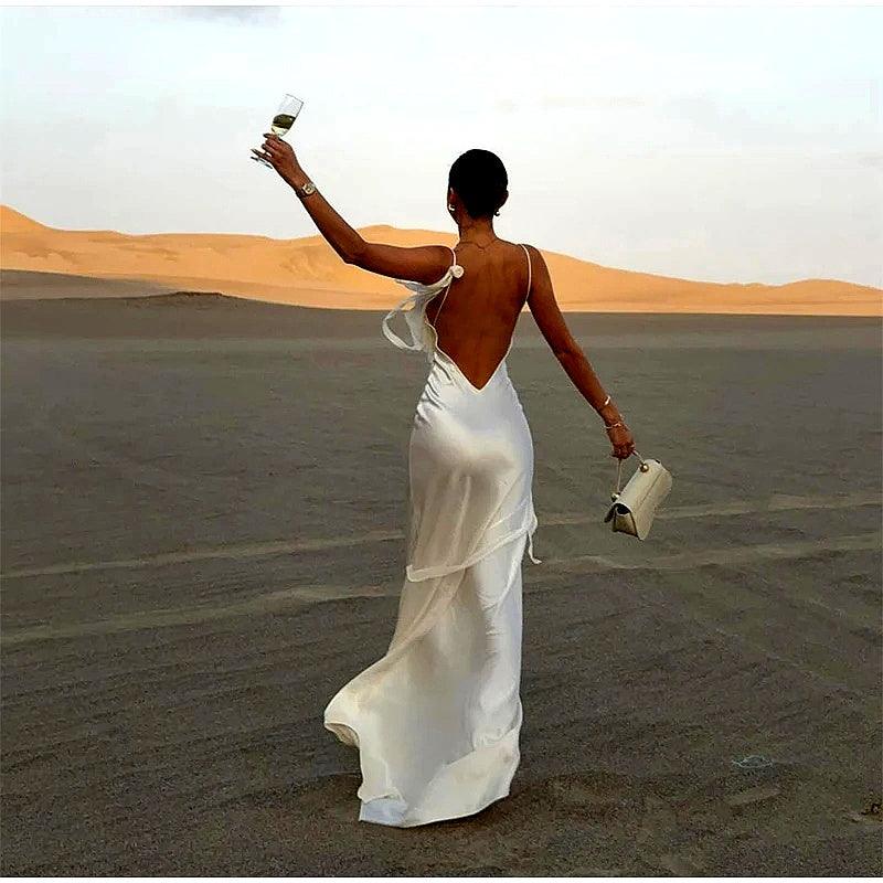Saten Kurdele Bağcıklı Sırtı Açık Maksi Elbise