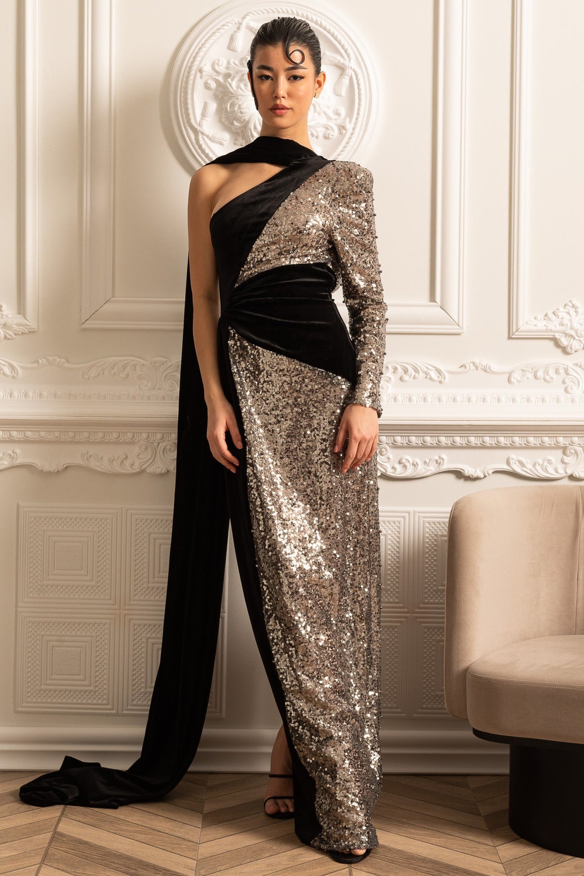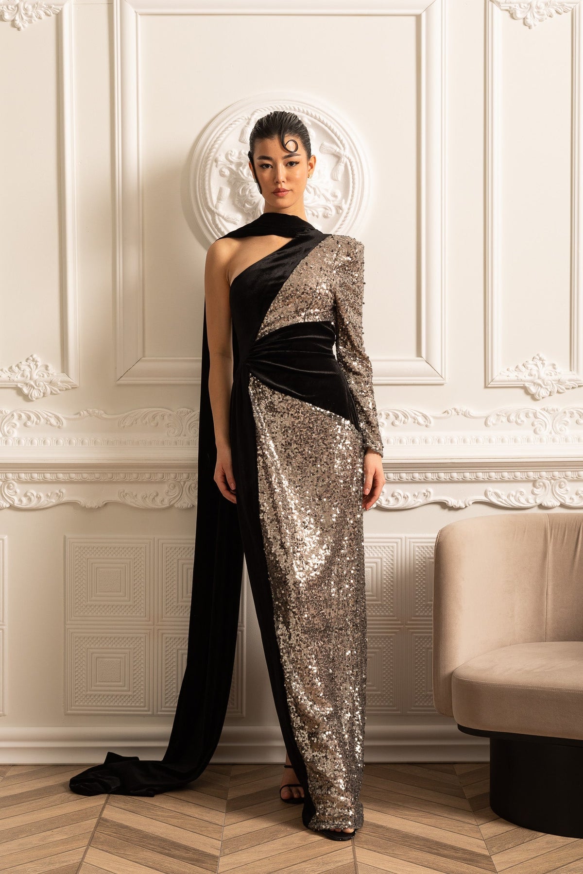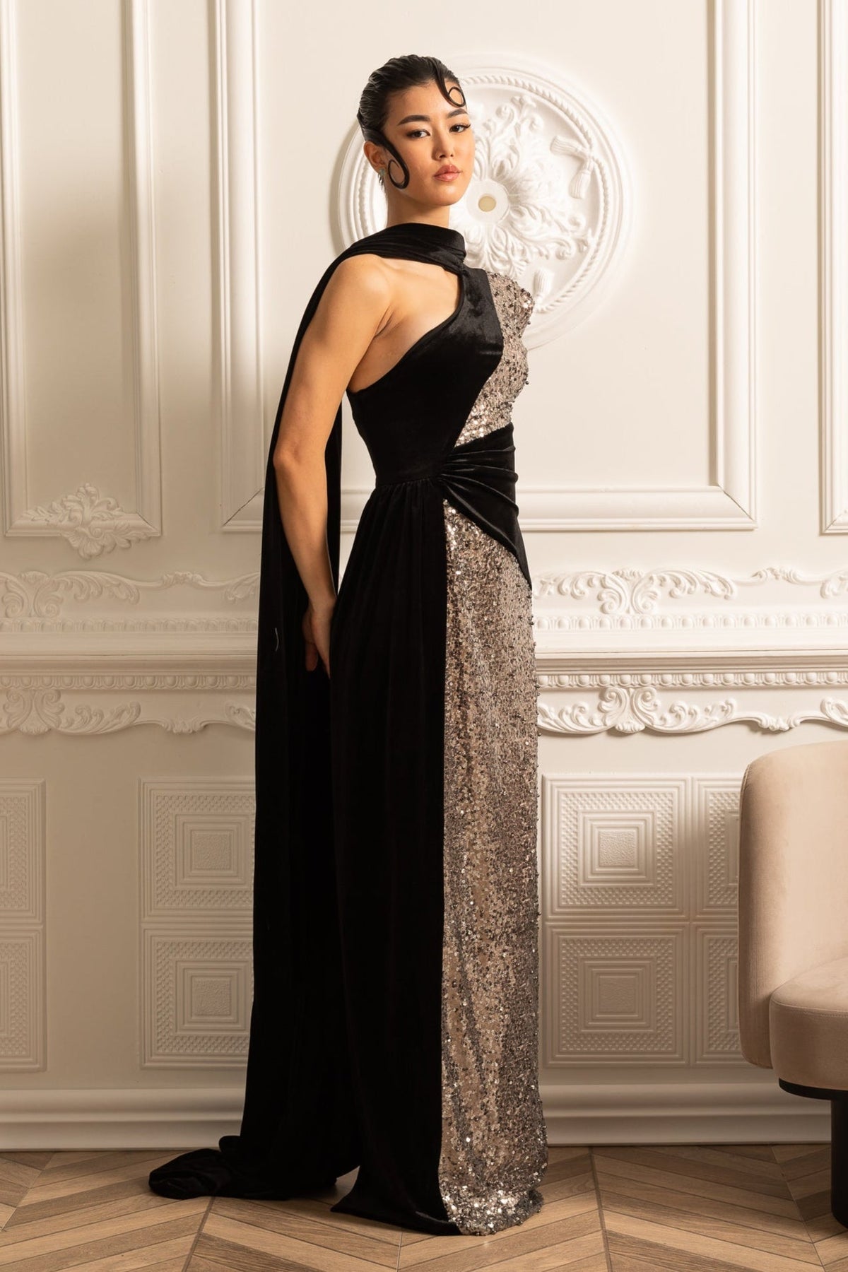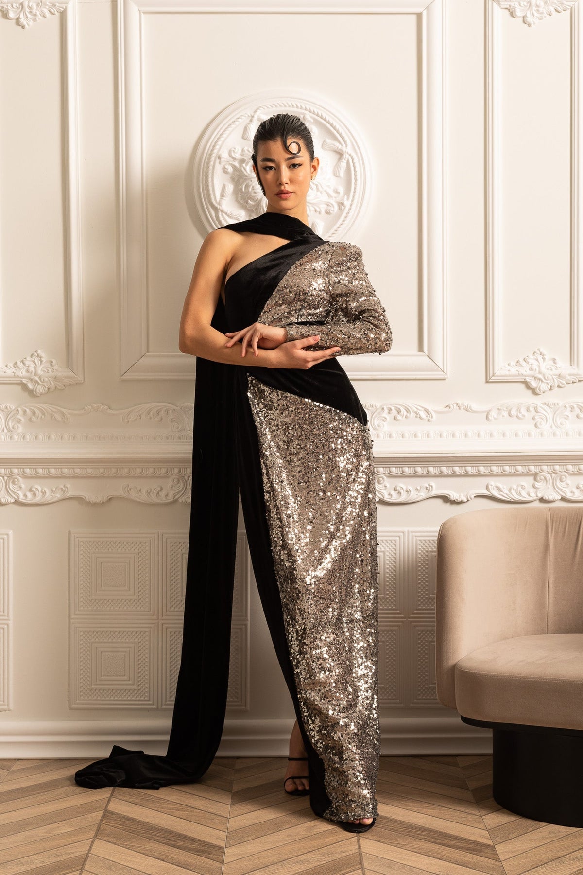 Kumaş Türü: Lüks siyah kadife kumaş, gümüş pul işlemeleri ve tüy detayları