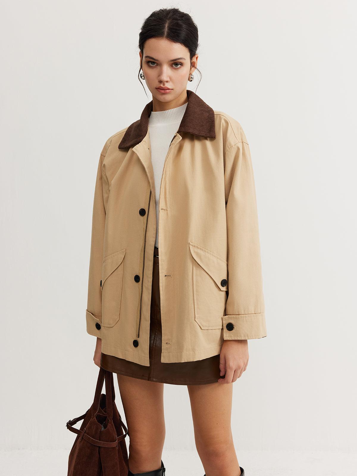 Bej rengin sade ve huzurlu havası, taba renkli kadife yaka detayıyla sıcak ve nostaljik bir kontrast oluşturur.