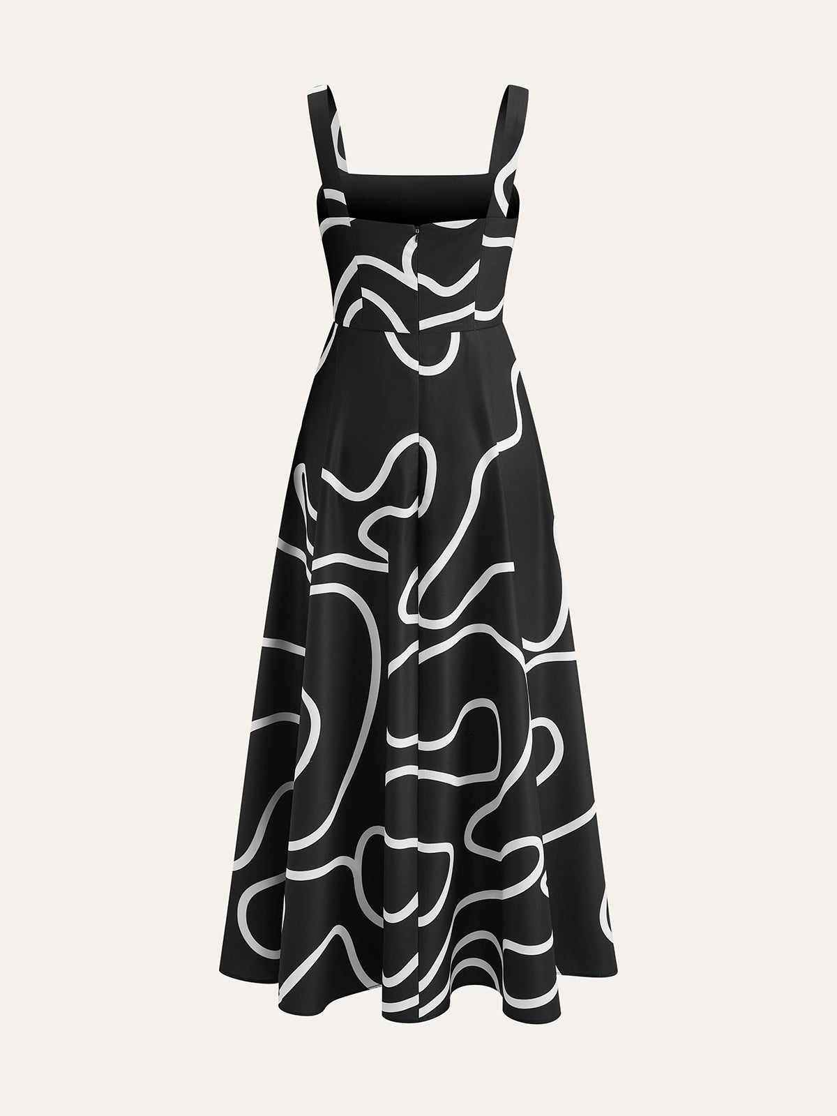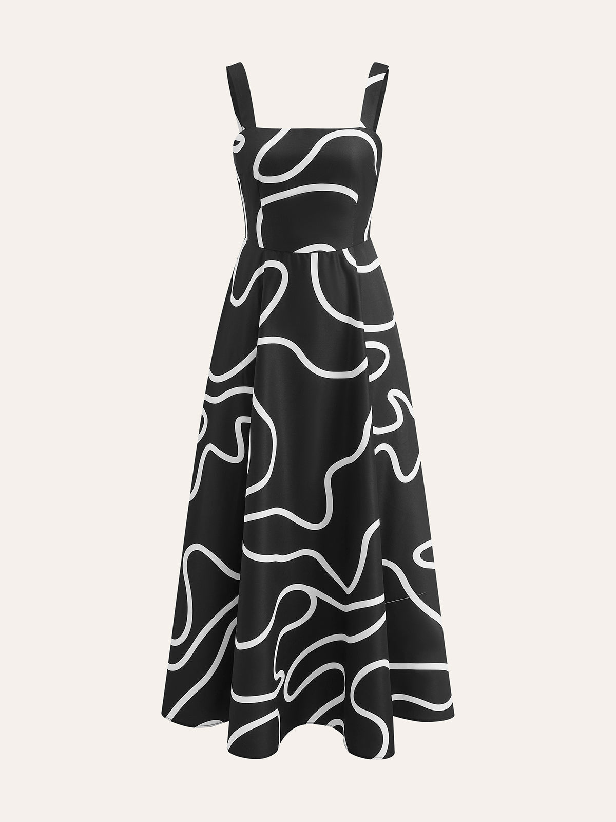 Soyut Çizgi Desenli Kare Askılı Elbise