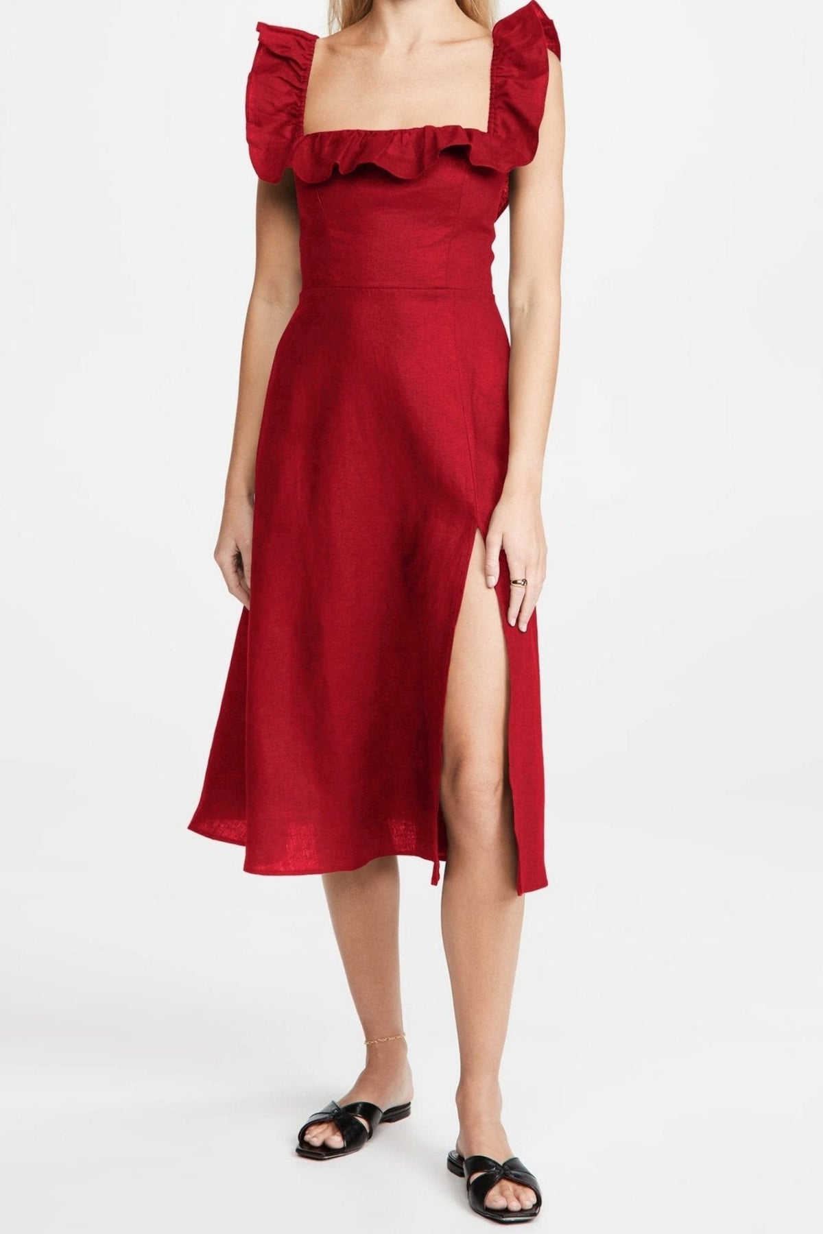 Alyss Fırfırlı Askılı Yırtmaçlı Midi Elbise