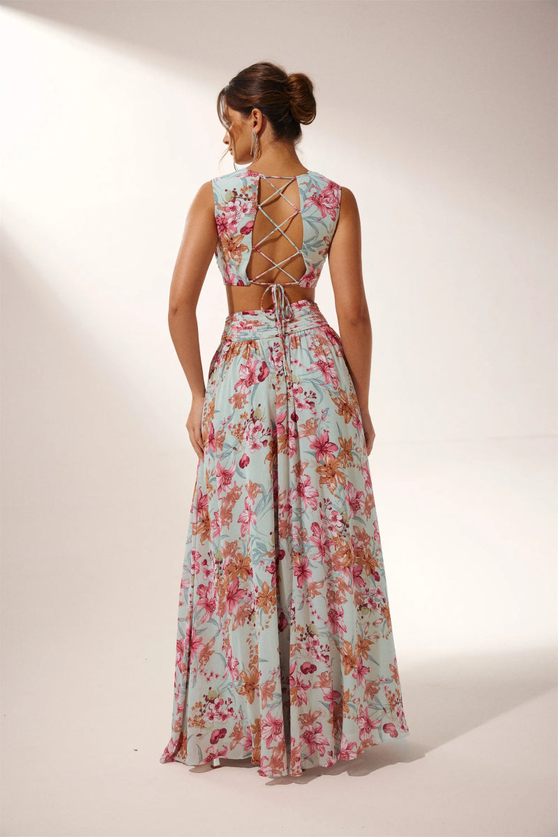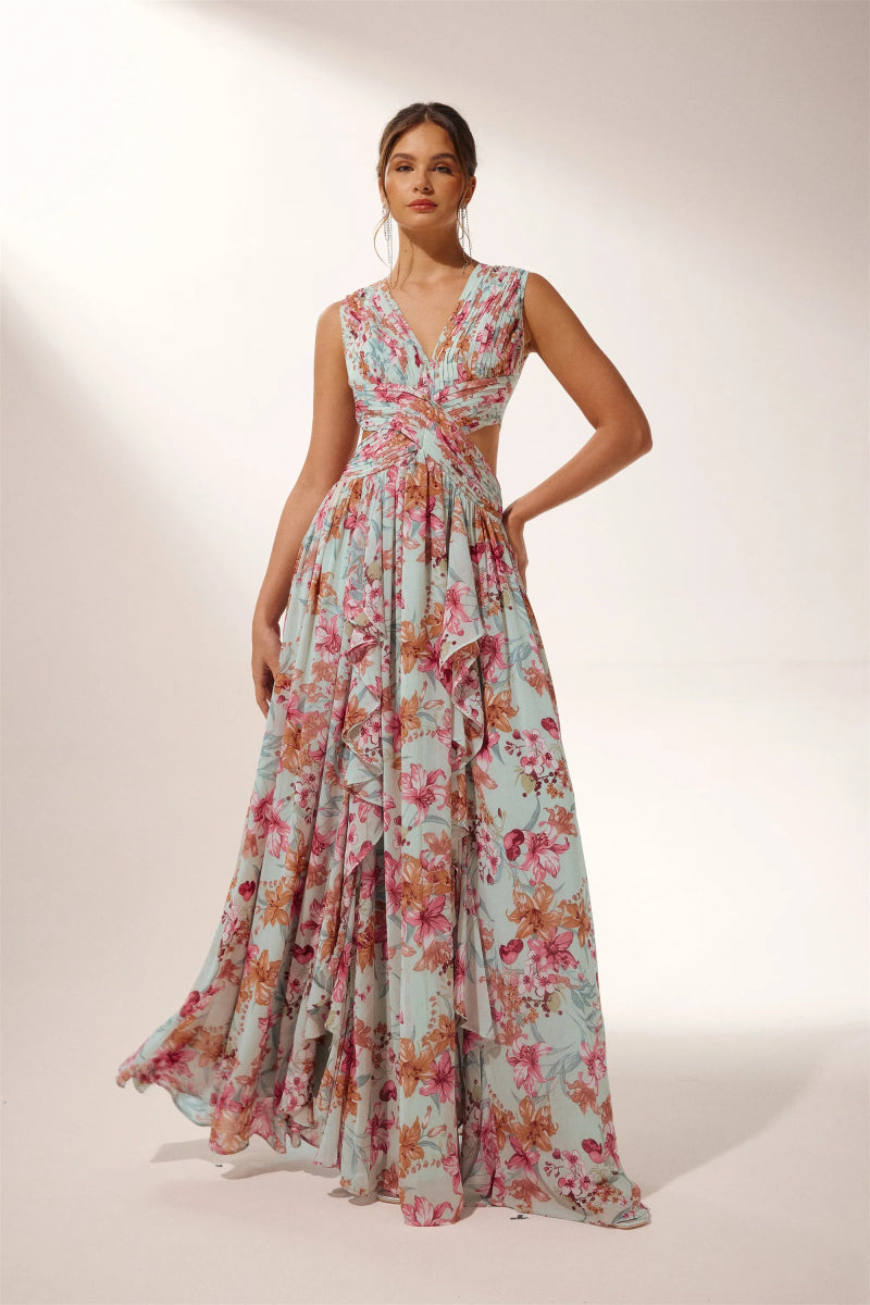 Anila Baskılı Pileli Fırfırlı Maxi Elbise