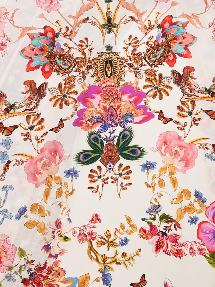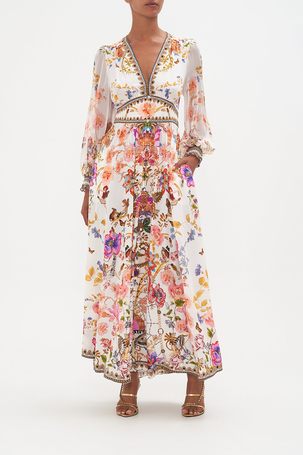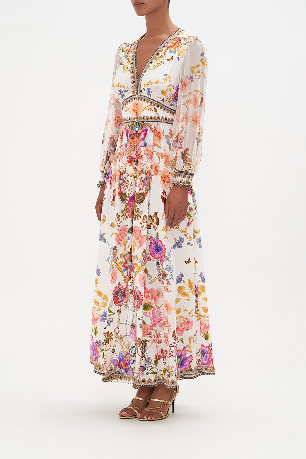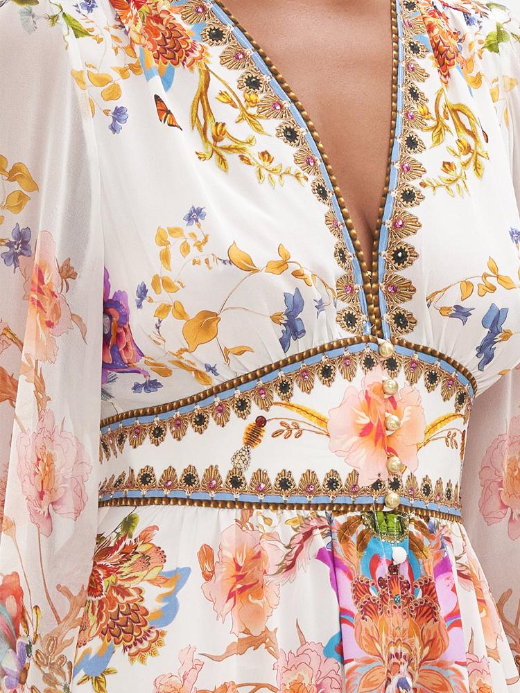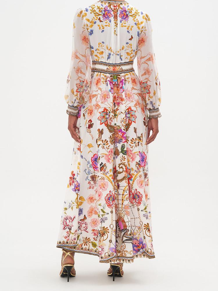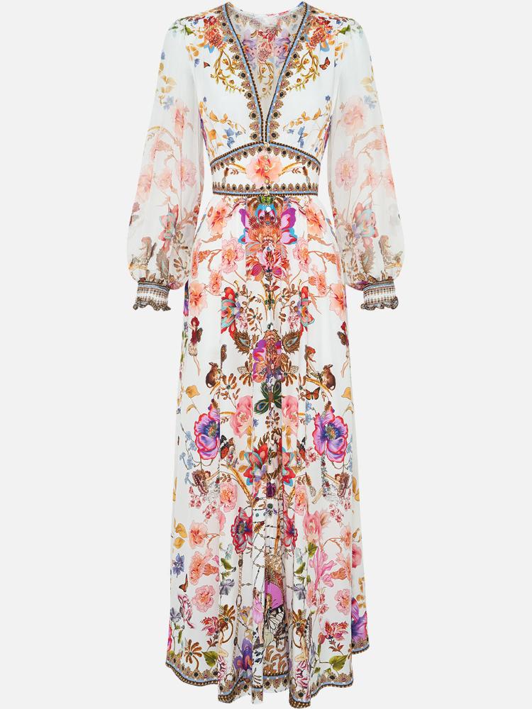 Belen Baskılı V Yaka Balon Kol Maxi Elbise