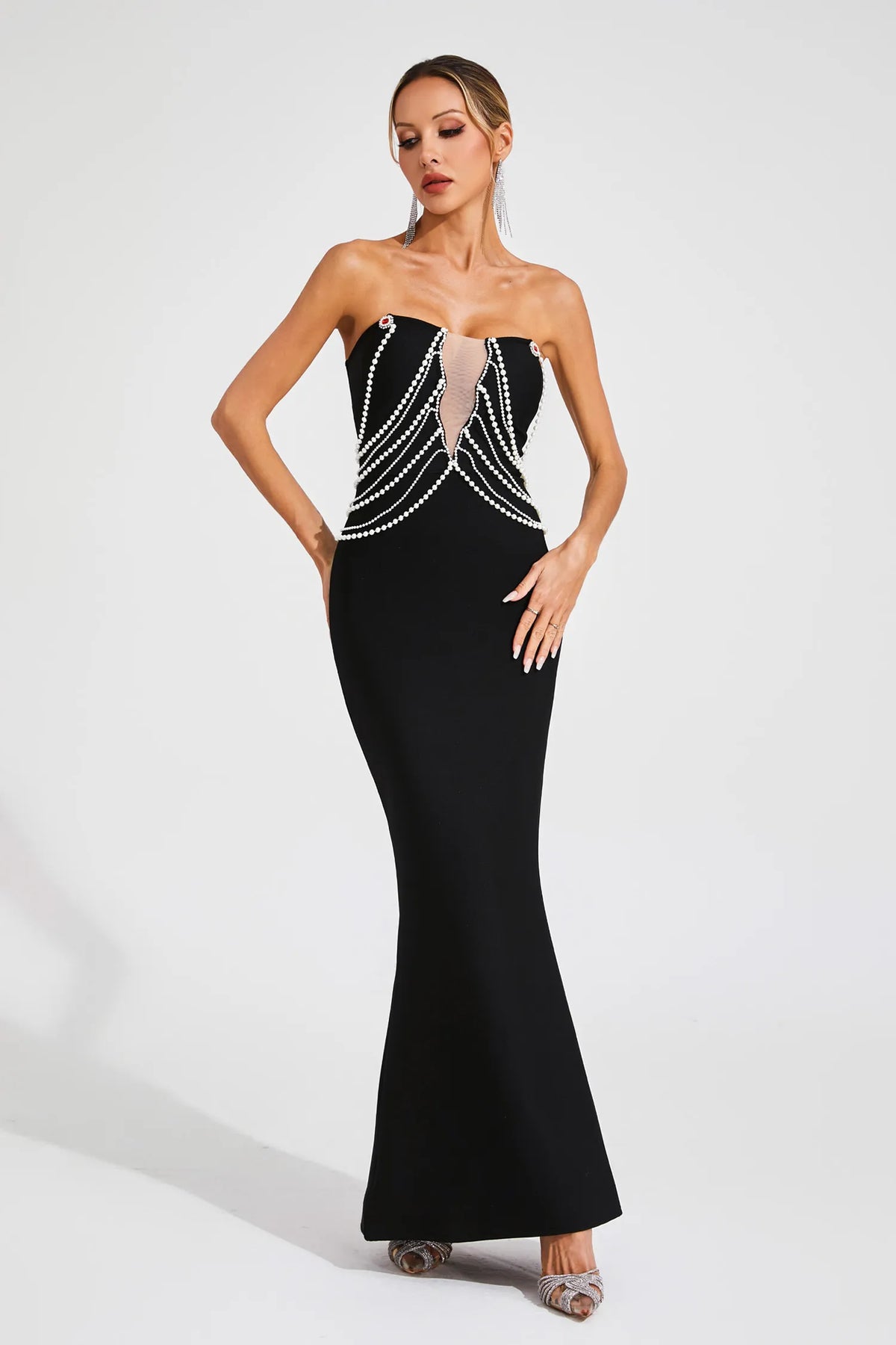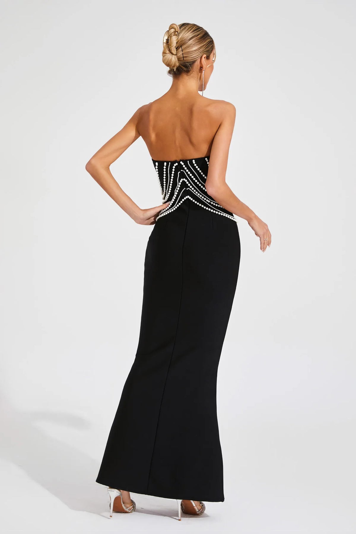 Delilah Siyah İncili Düşük Omuz Uzun Elbise