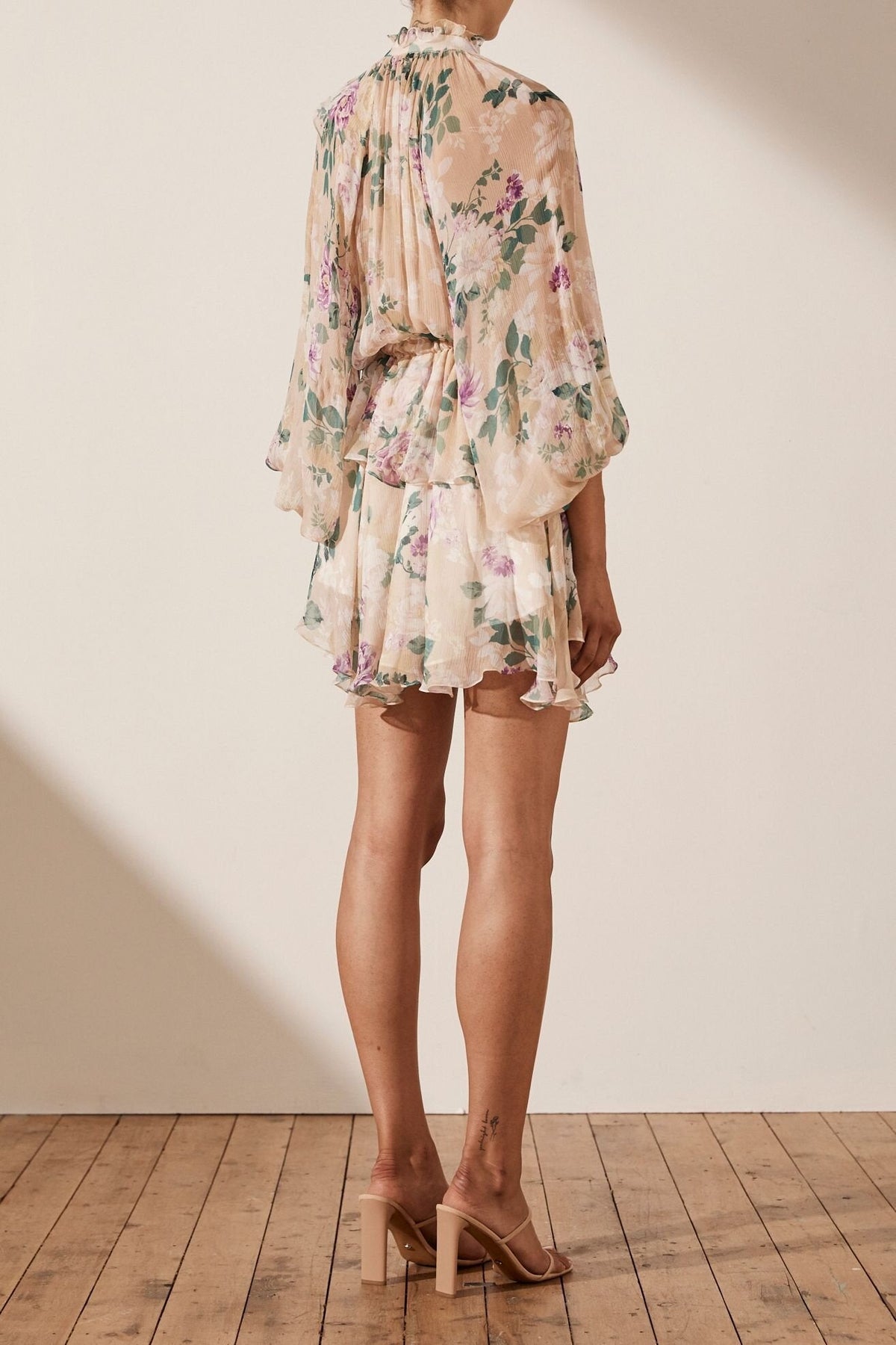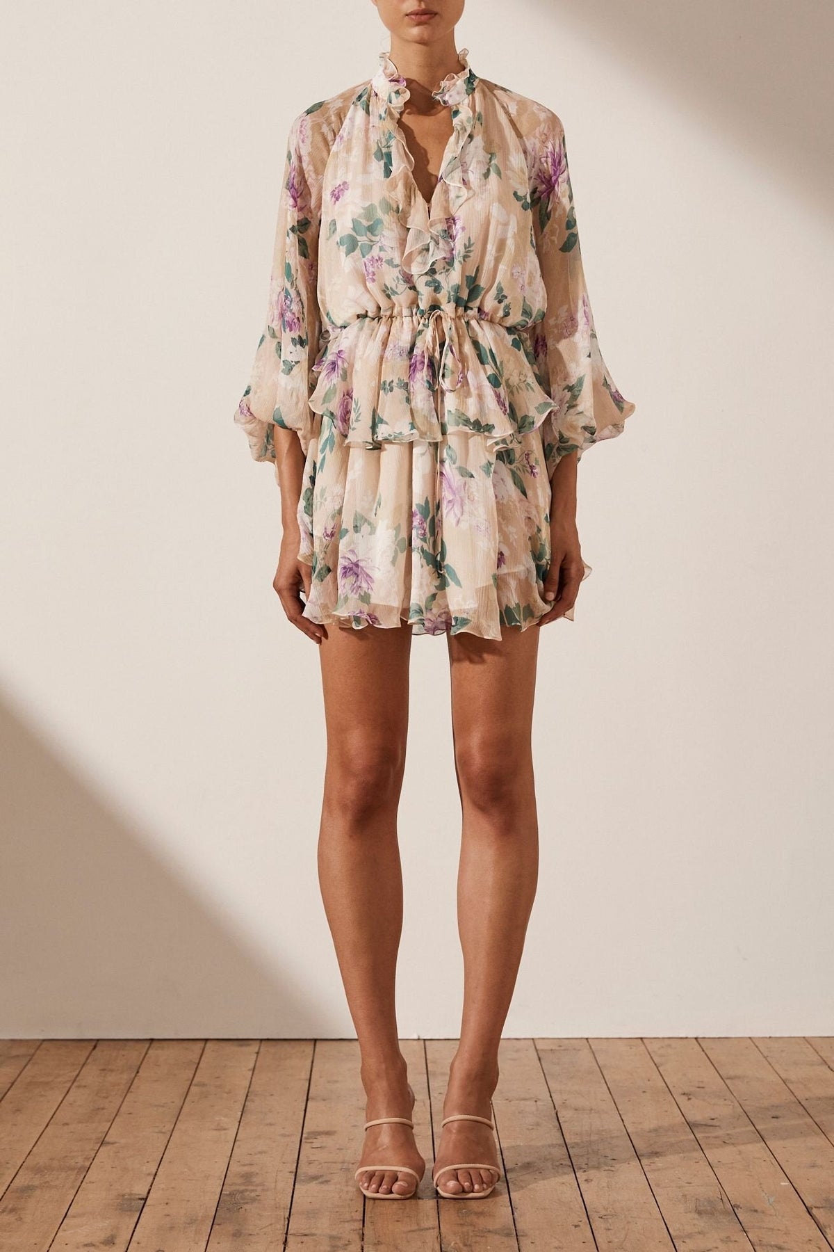 Dolores Baskılı V Yaka Şifon Mini Köylü Elbise