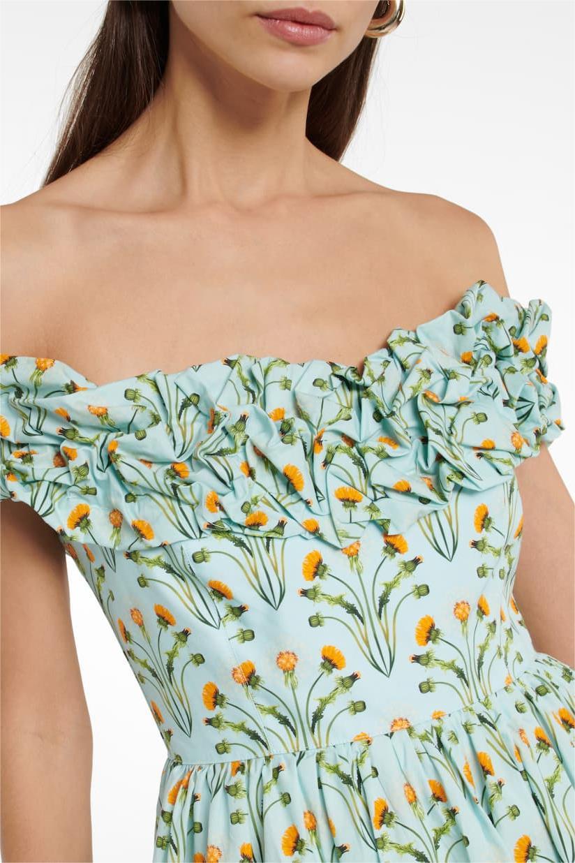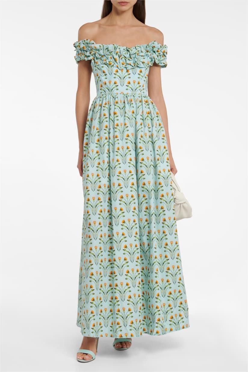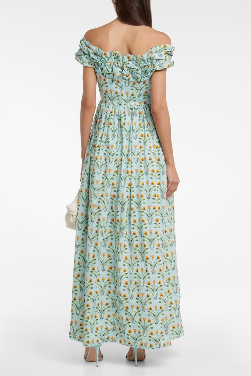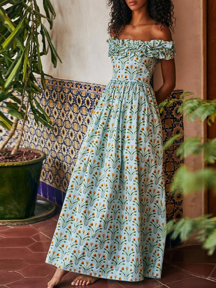 Donna Baskılı Fırfırlı Korse Düşük Omuzlu Maxi Elbise