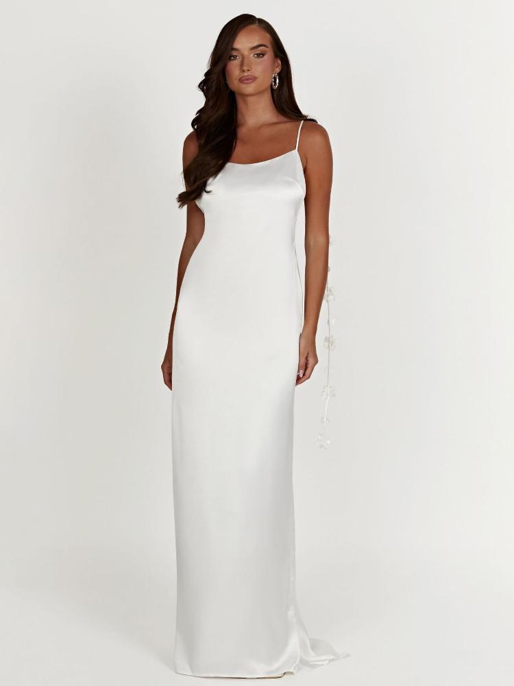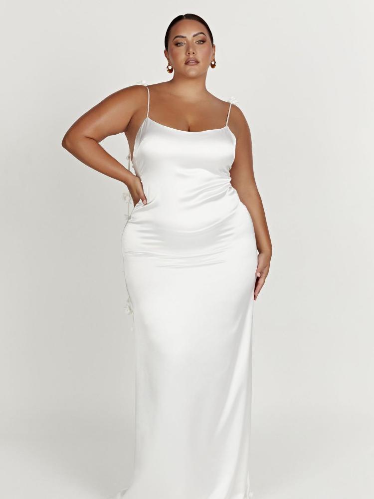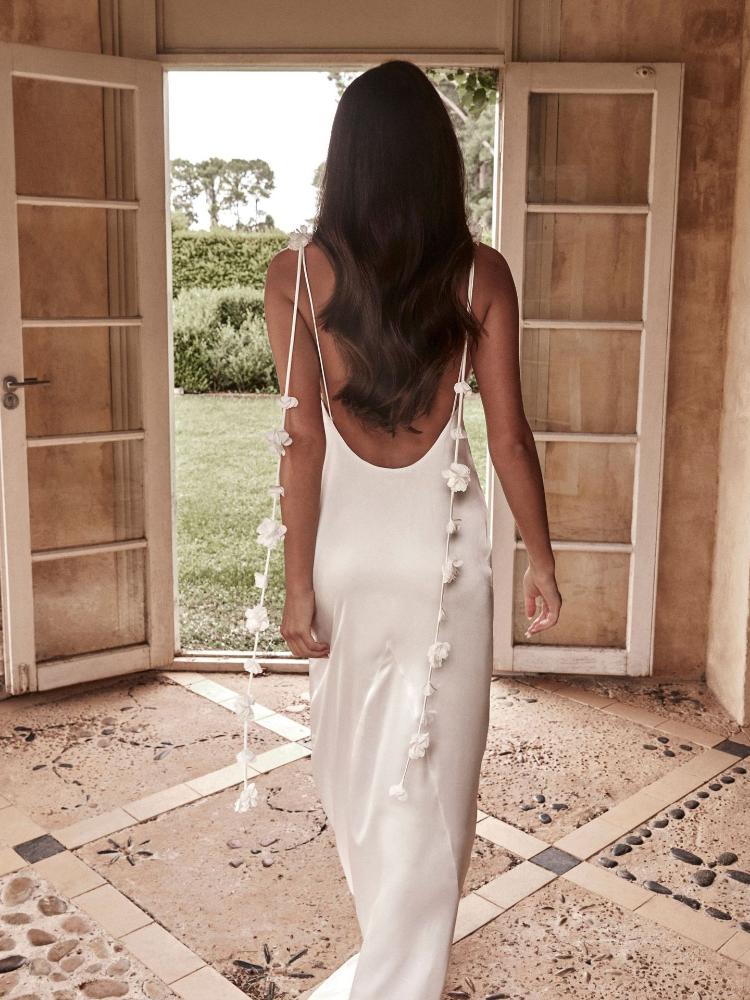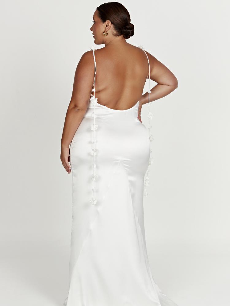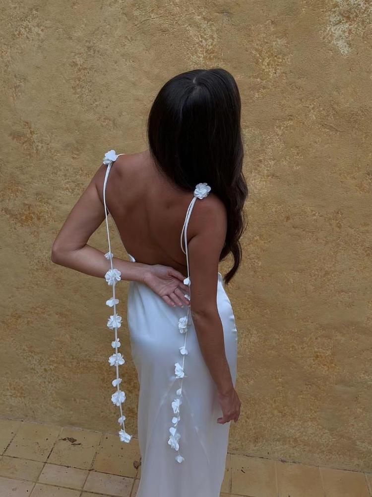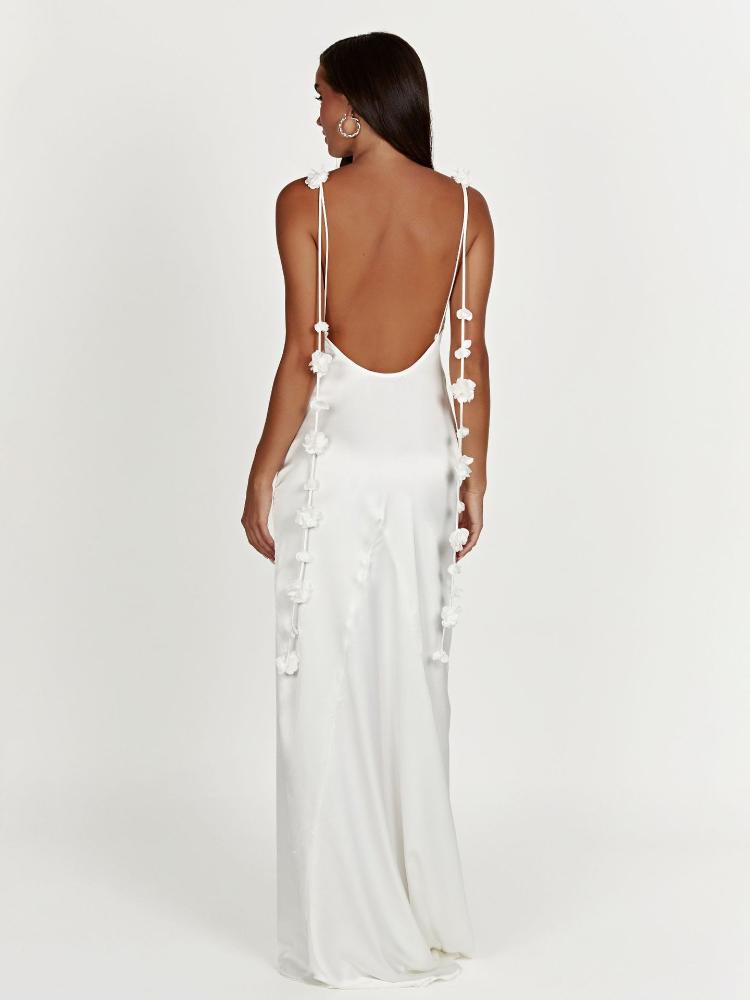 Evelyn Sırtı Açık Çiçek Püsküllü Saten Maxi Elbise