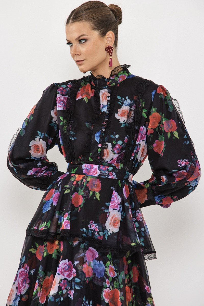 Hazel Çiçekli Katlı Şifon Maxi Elbise