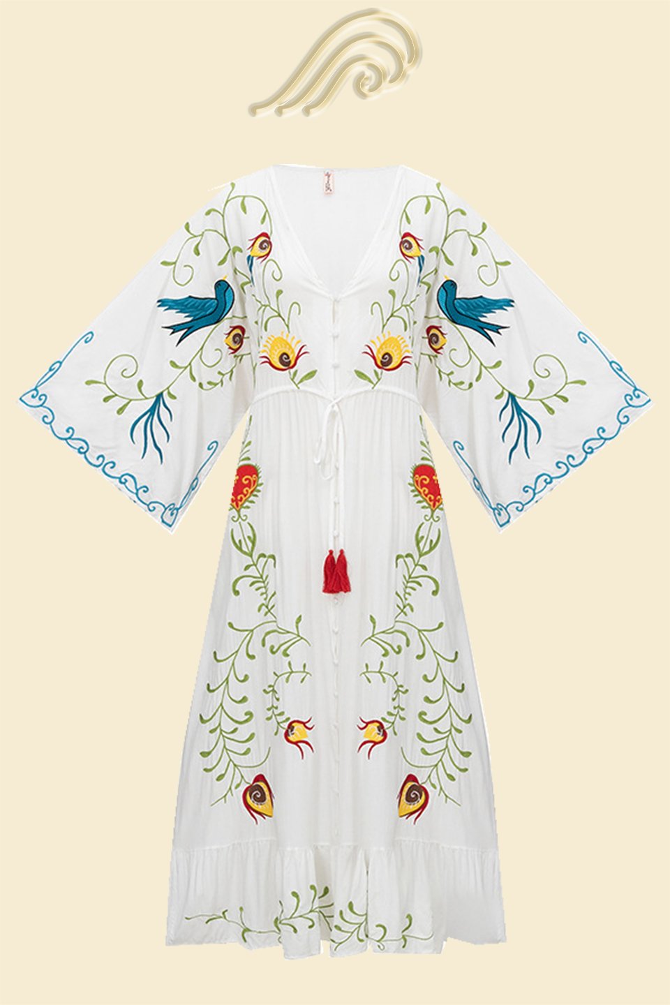 Lola İşlemeli V Yaka Bağcıklı Elbise