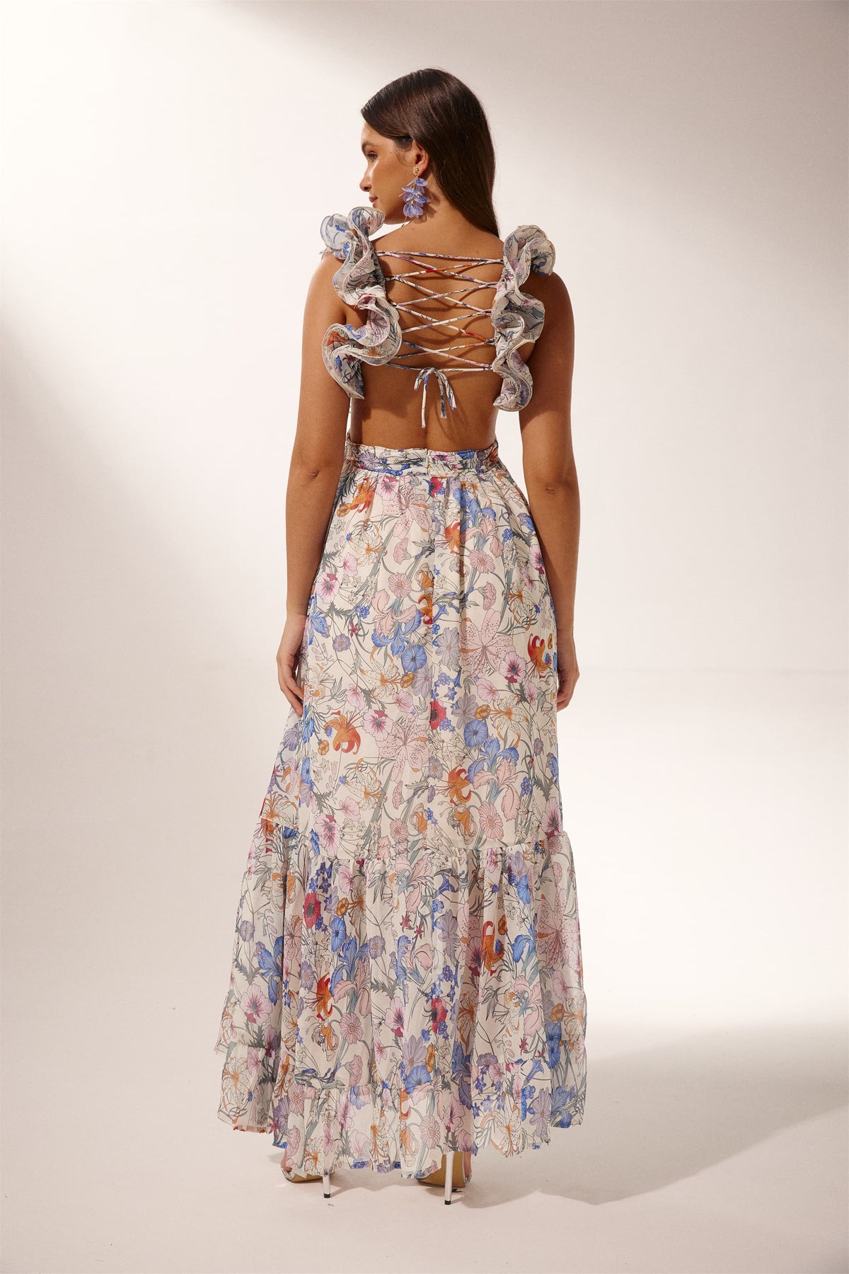 Marissa Kesikli Fırfırlı Uzun Elbise