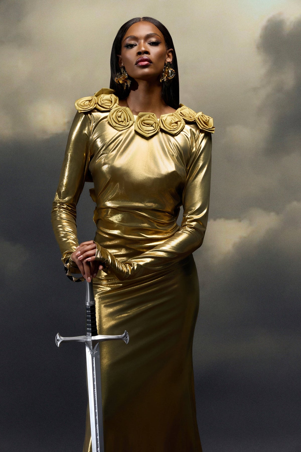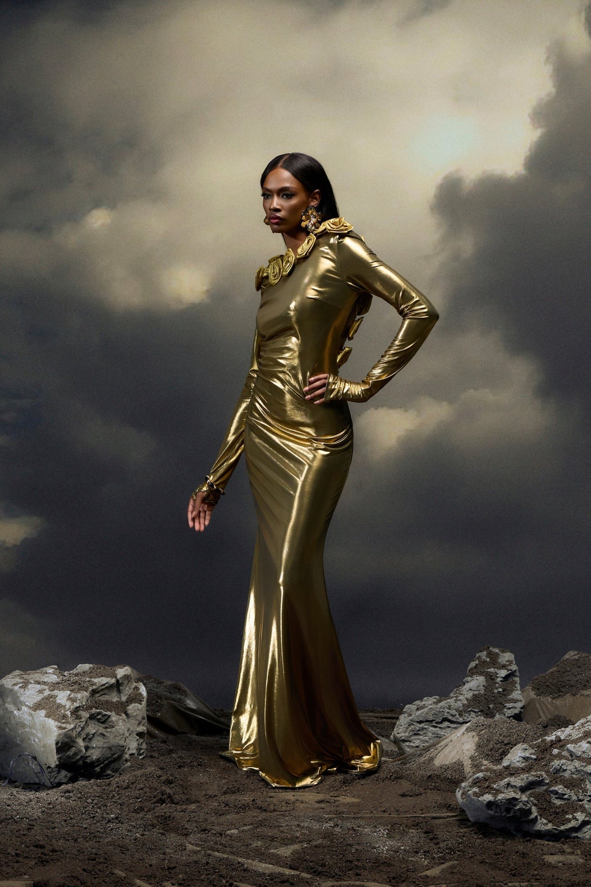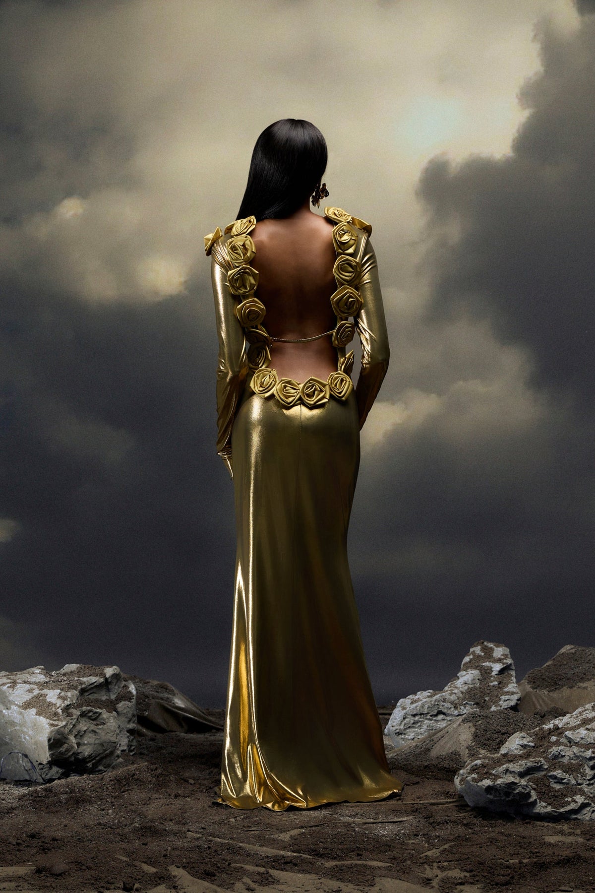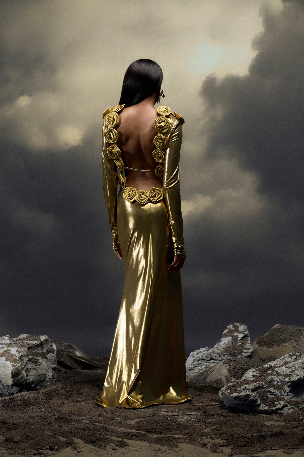 Octavia Çiçek Aplikeli Sırtı Açık Uzun Elbise