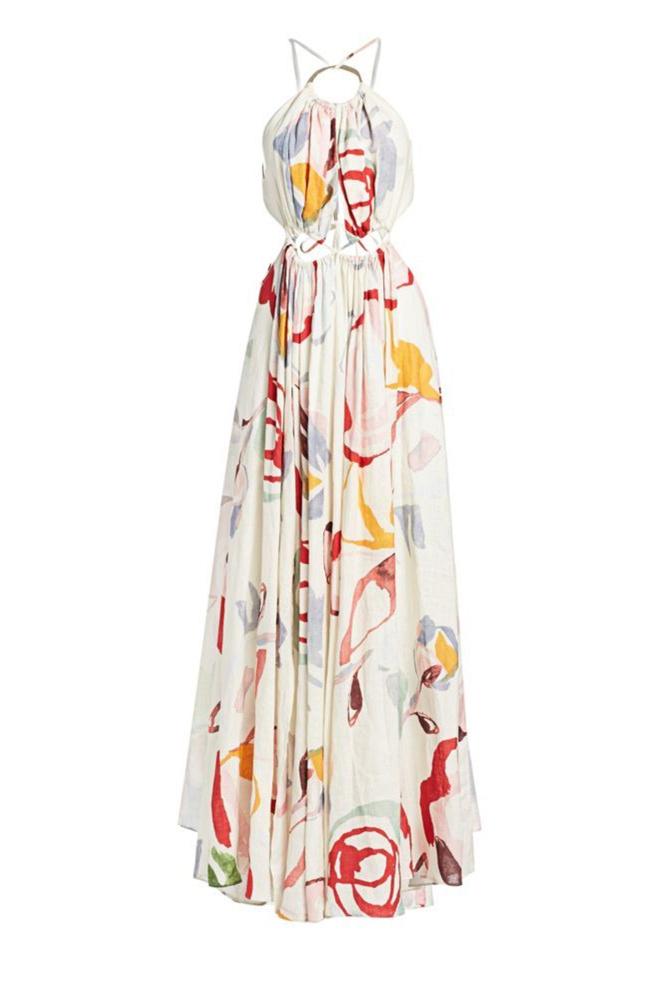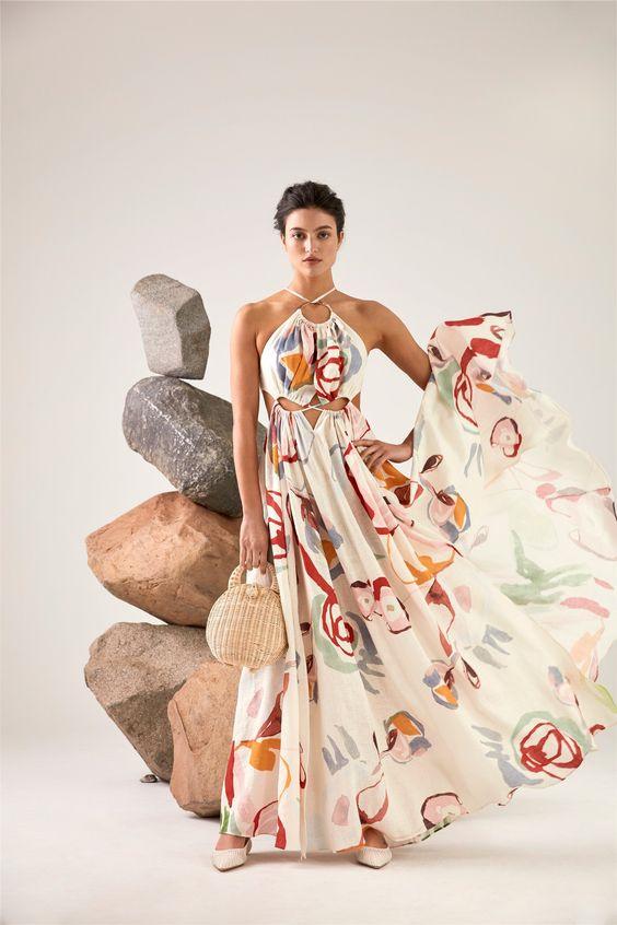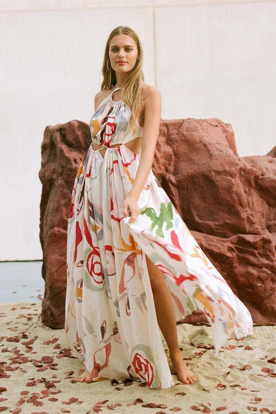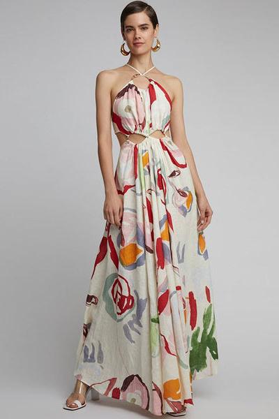 Sabina Soyut Çiçek Boyundan Bağlı Uzun Elbise