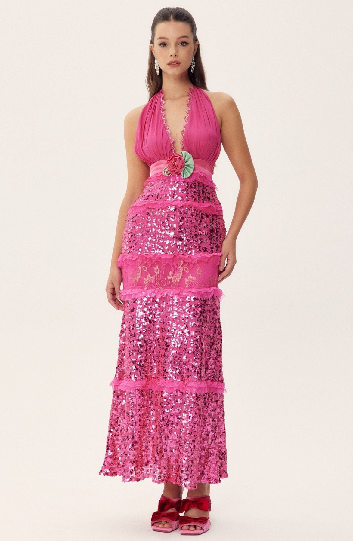 Sara Boyundan Bağlamalı Payet İşlemeli Maxi Elbise