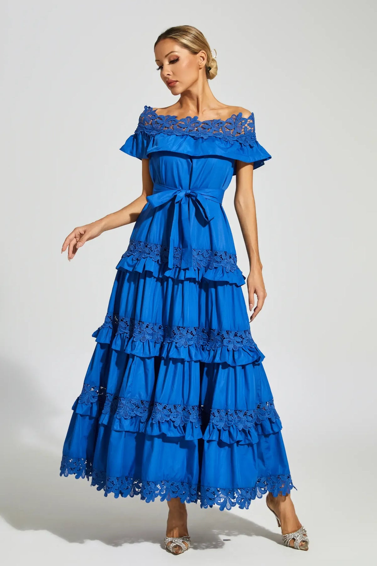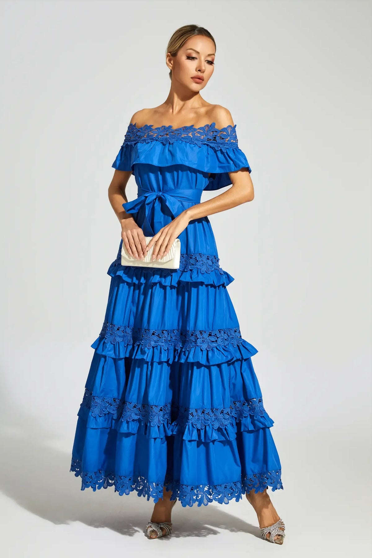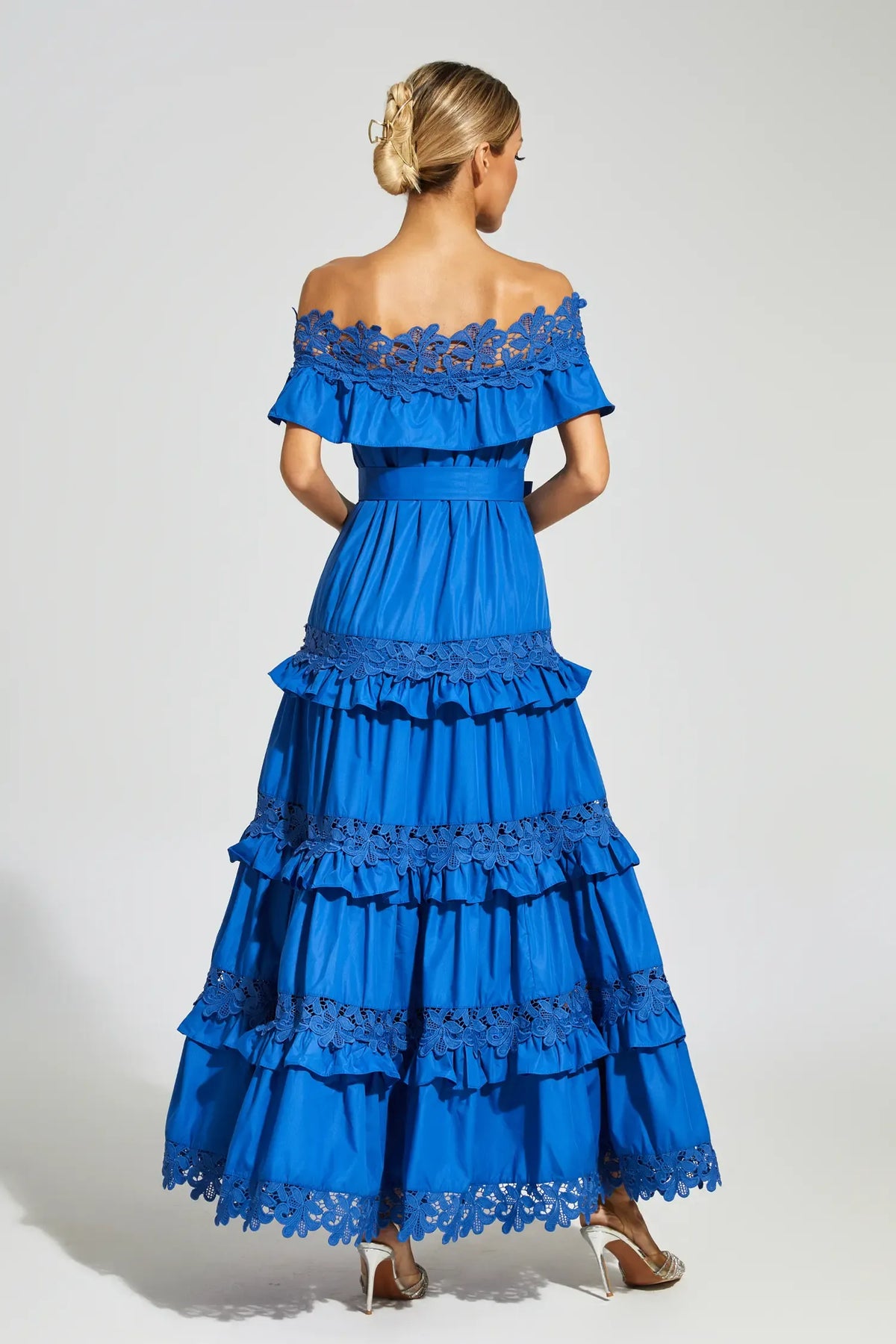 Soraya Deniz Mavisi Fırfırlı Düşük Omuz Maxi Elbise