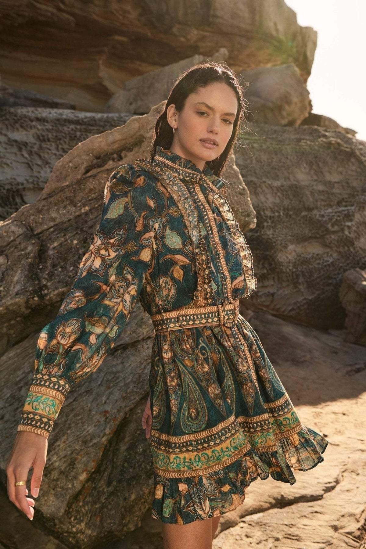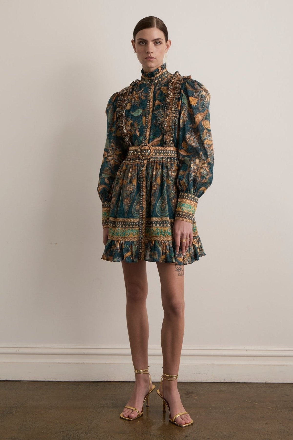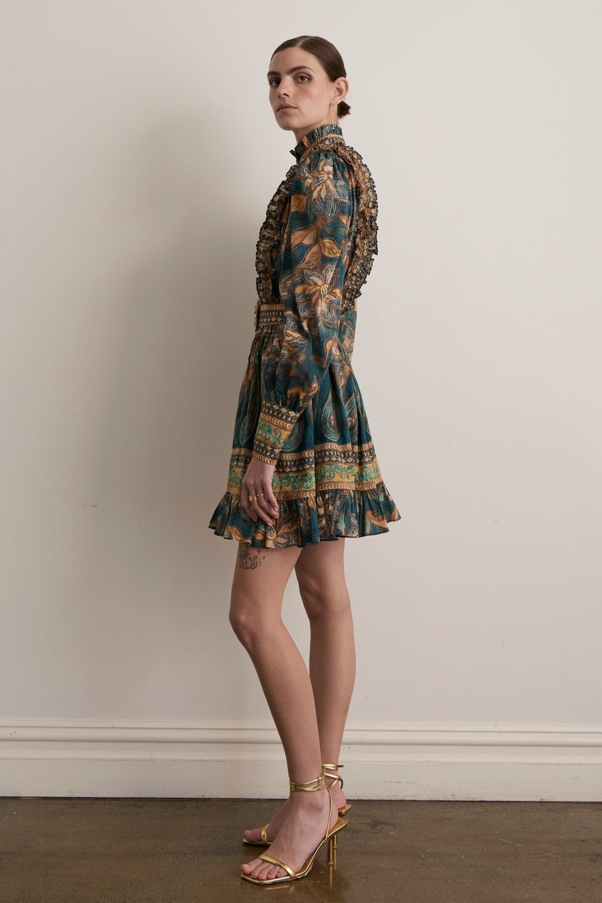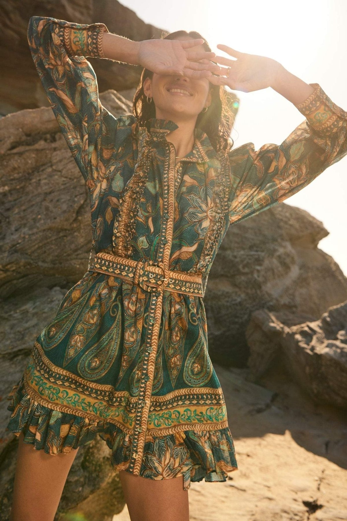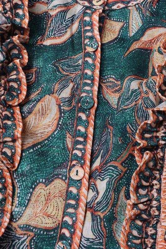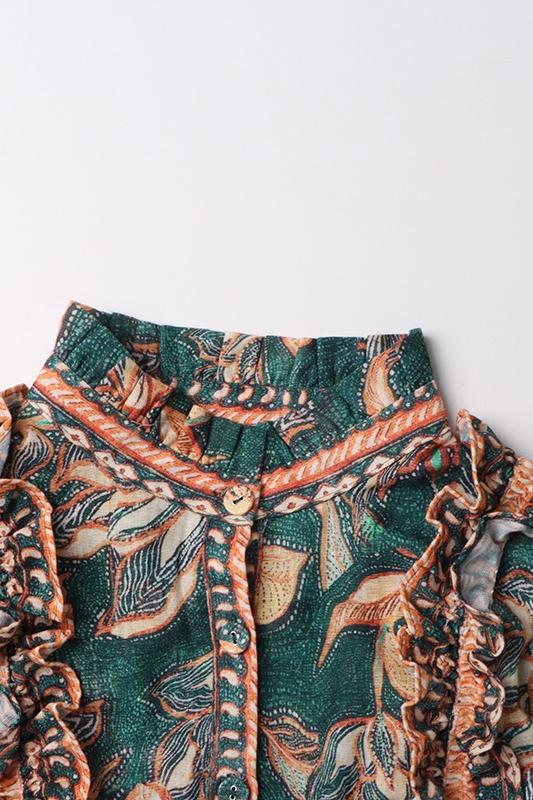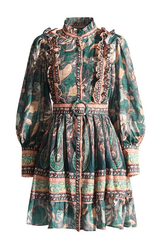 Abigail Baskılı Fırfırlı Kuşaklı Mini Gömlek Elbise