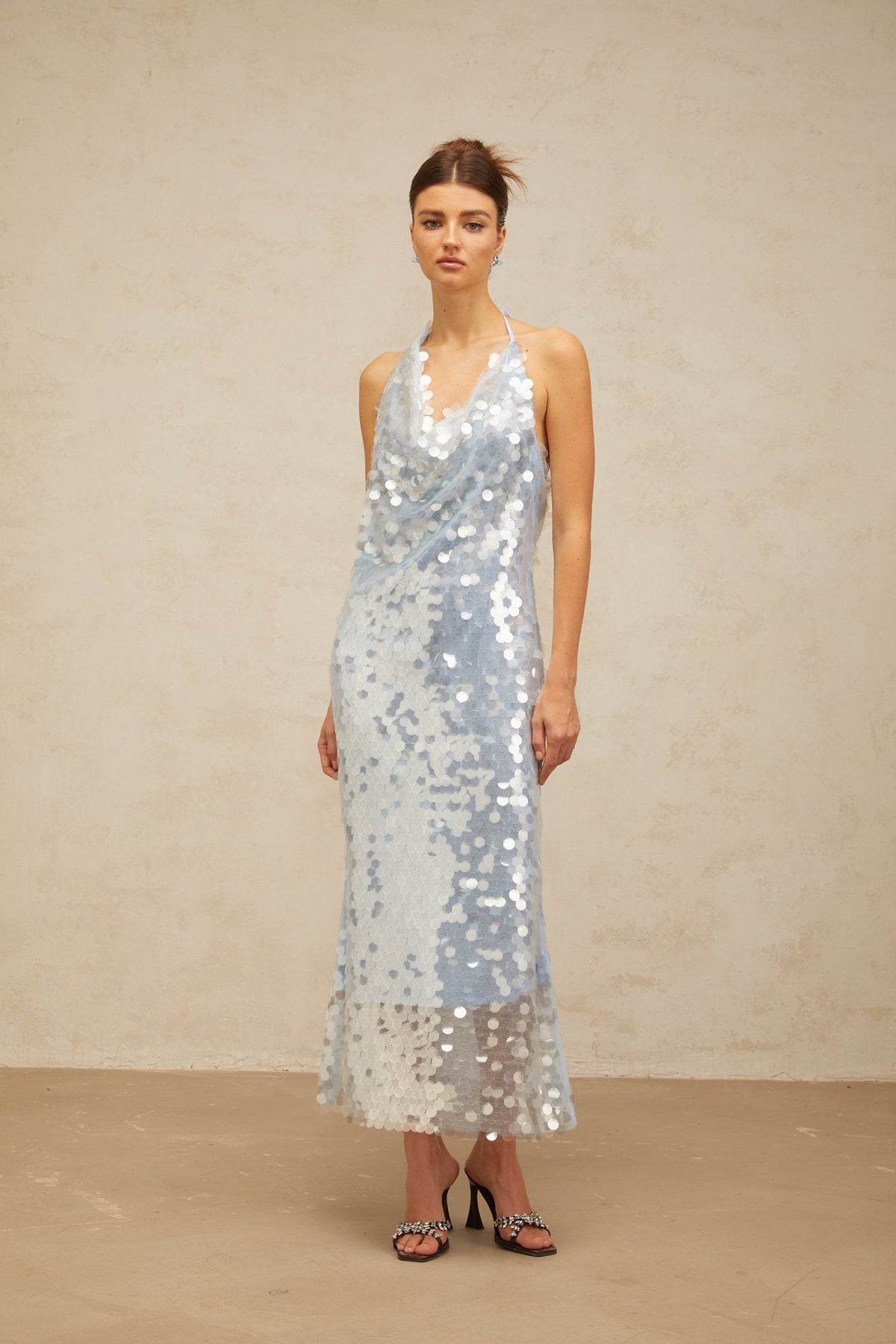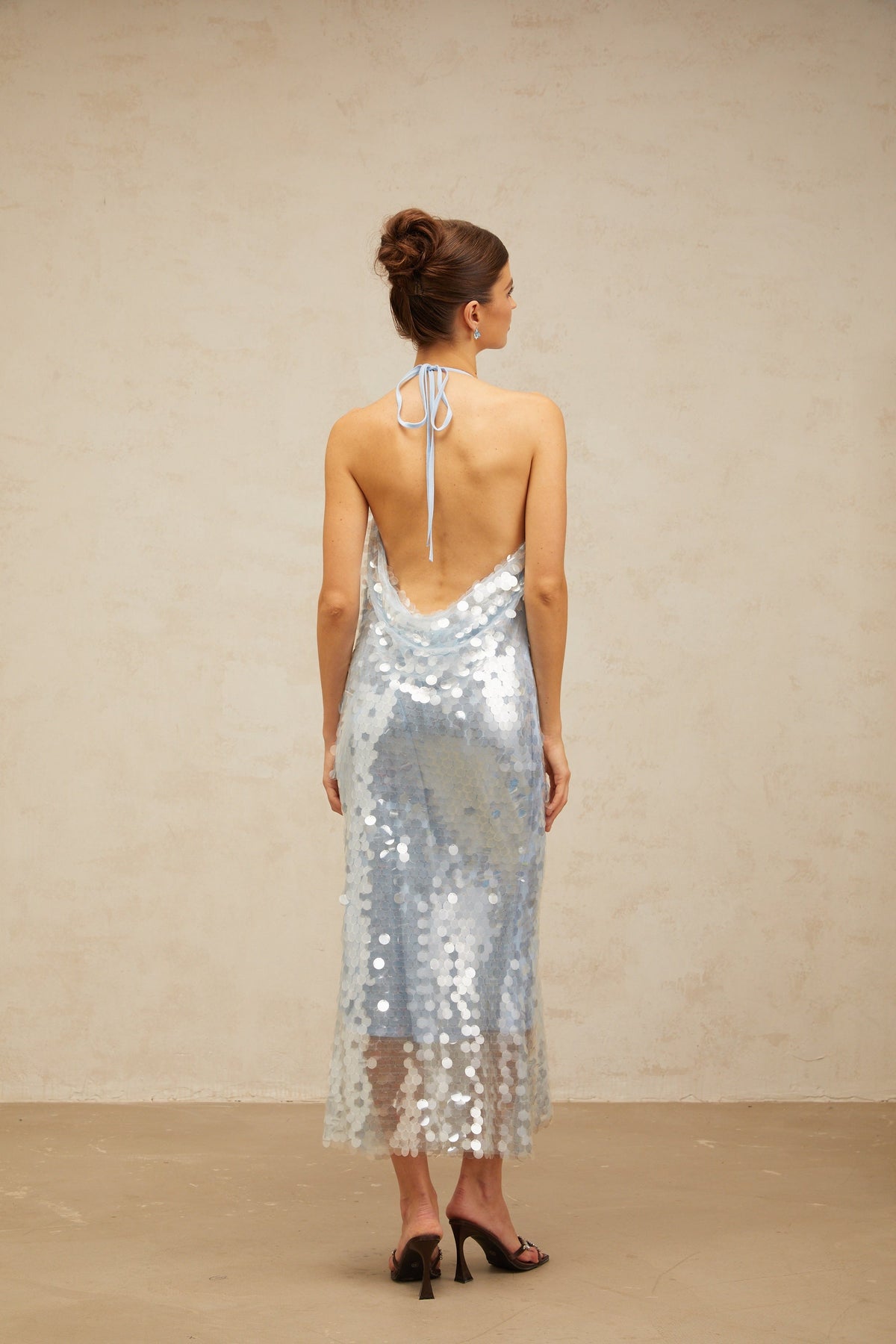 Öne Çıkan Özellikler – Babette Mavi Halter Yaka Payetli Midi Elbise