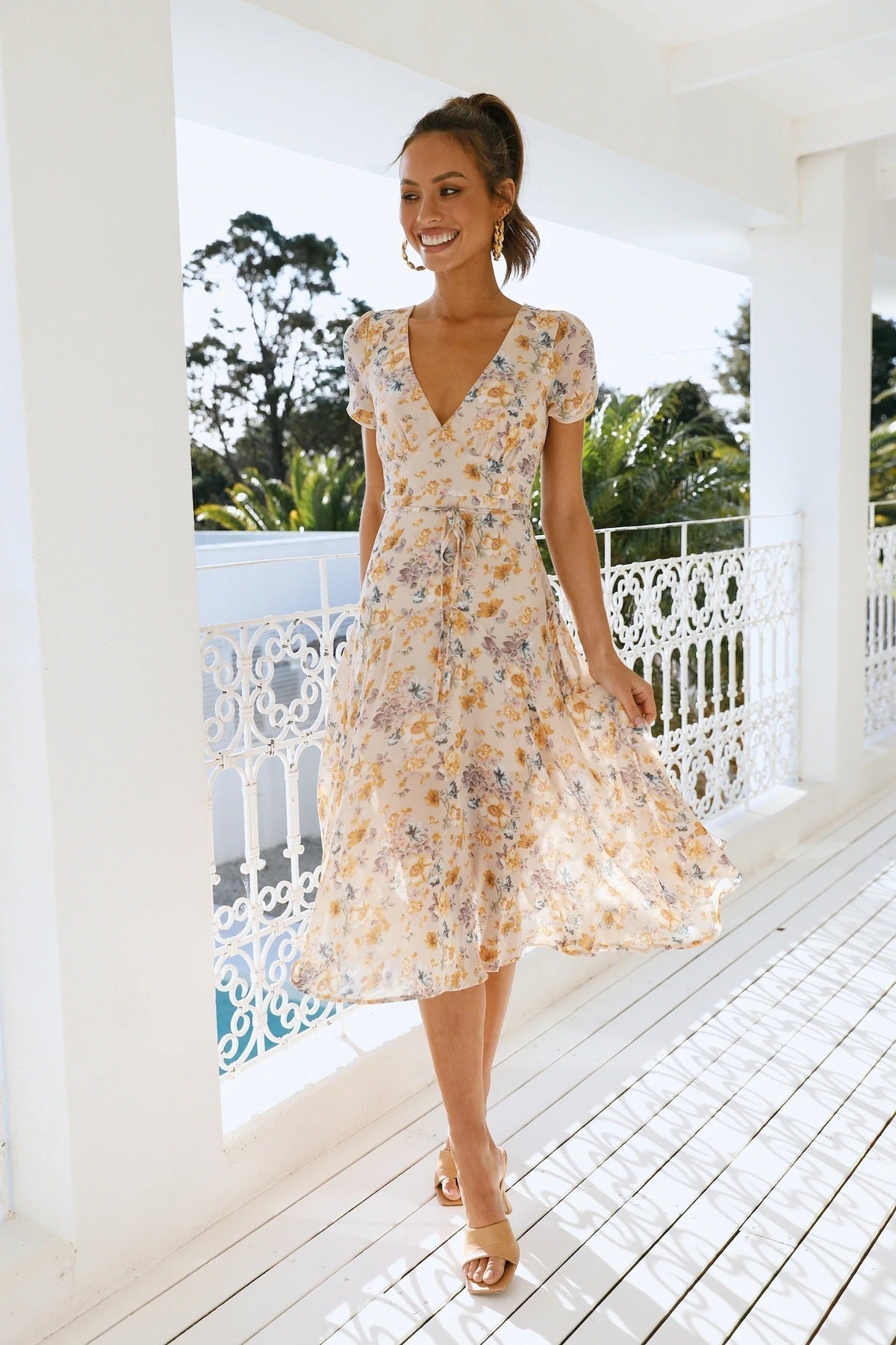 Celeste Baskılı V Yaka Bağcıklı Midi Elbise