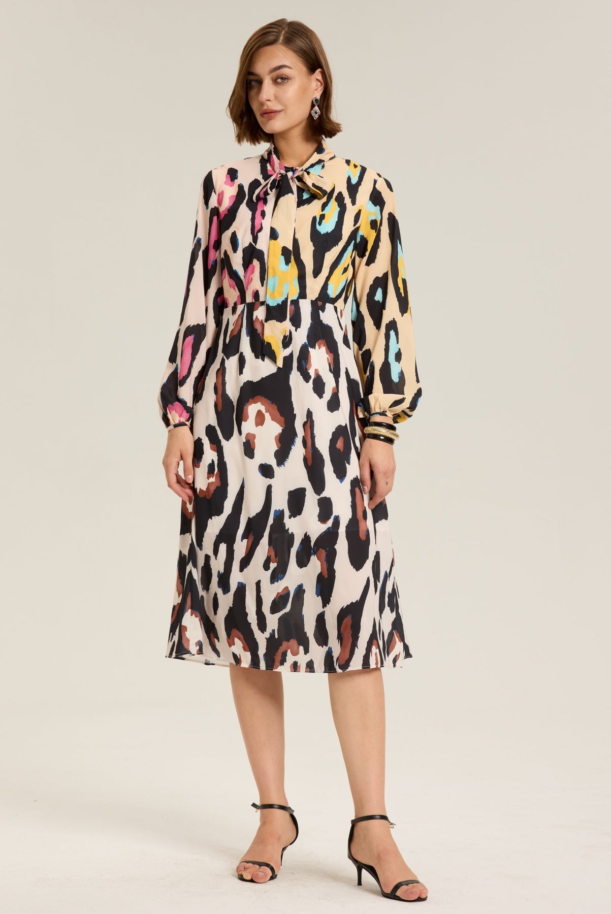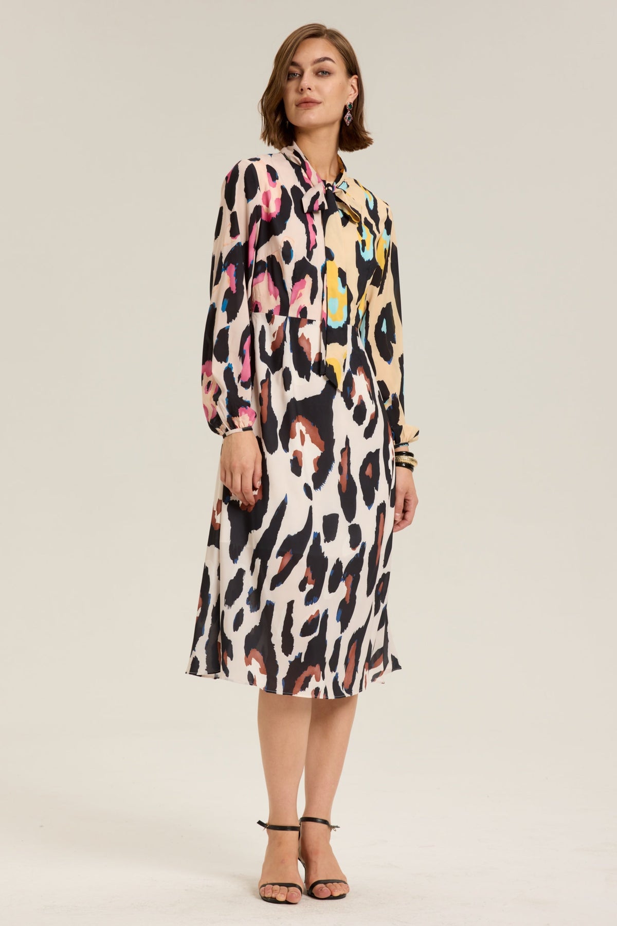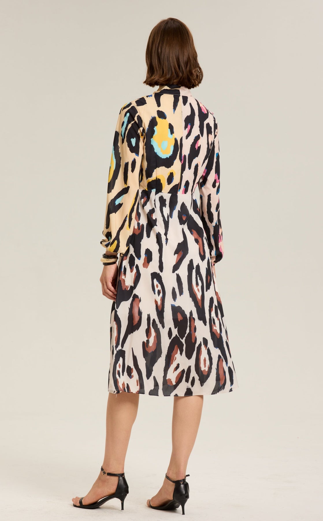 Monica Leopar Desenli Blok Renk Midi Elbise