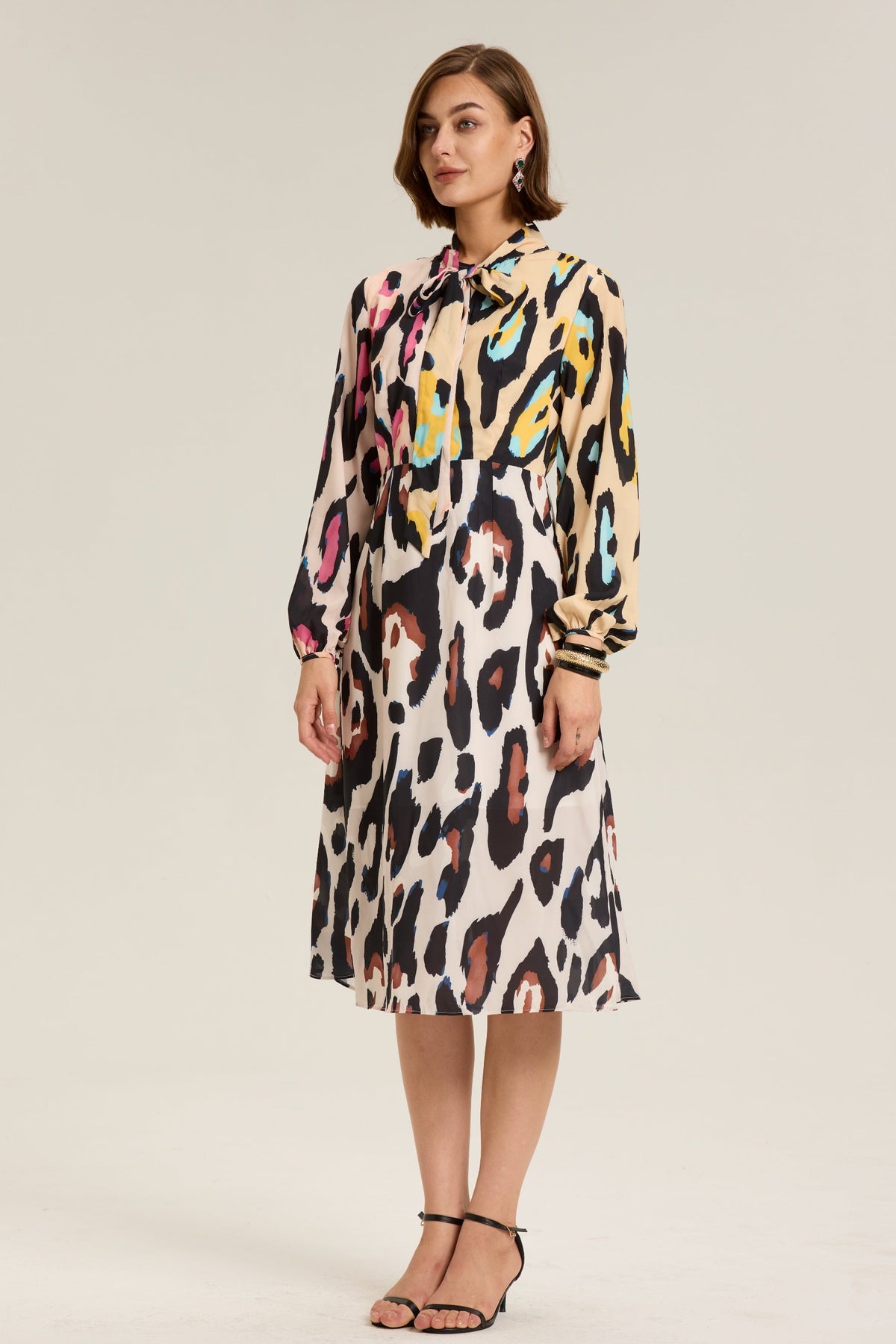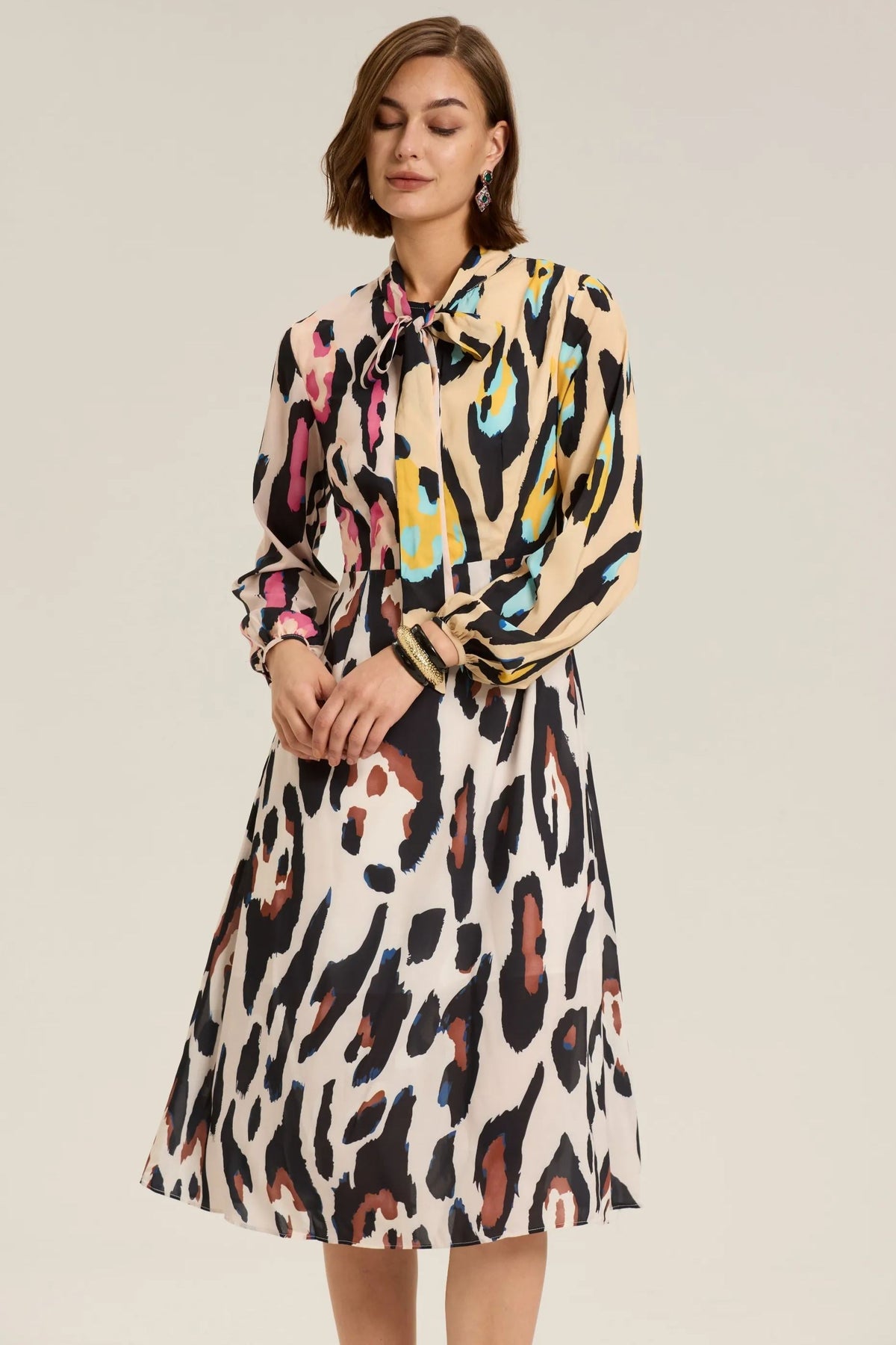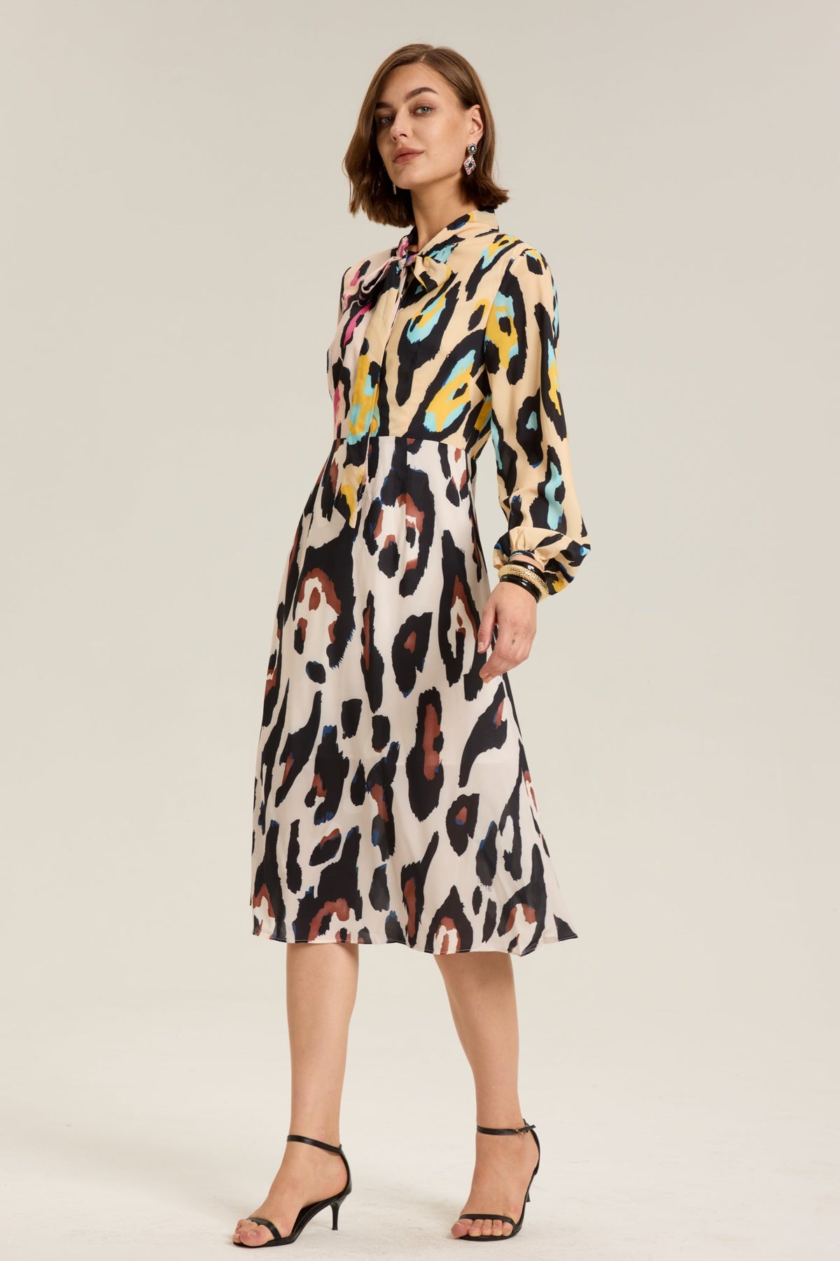 Monica Leopar Desenli Blok Renk Midi Elbise
