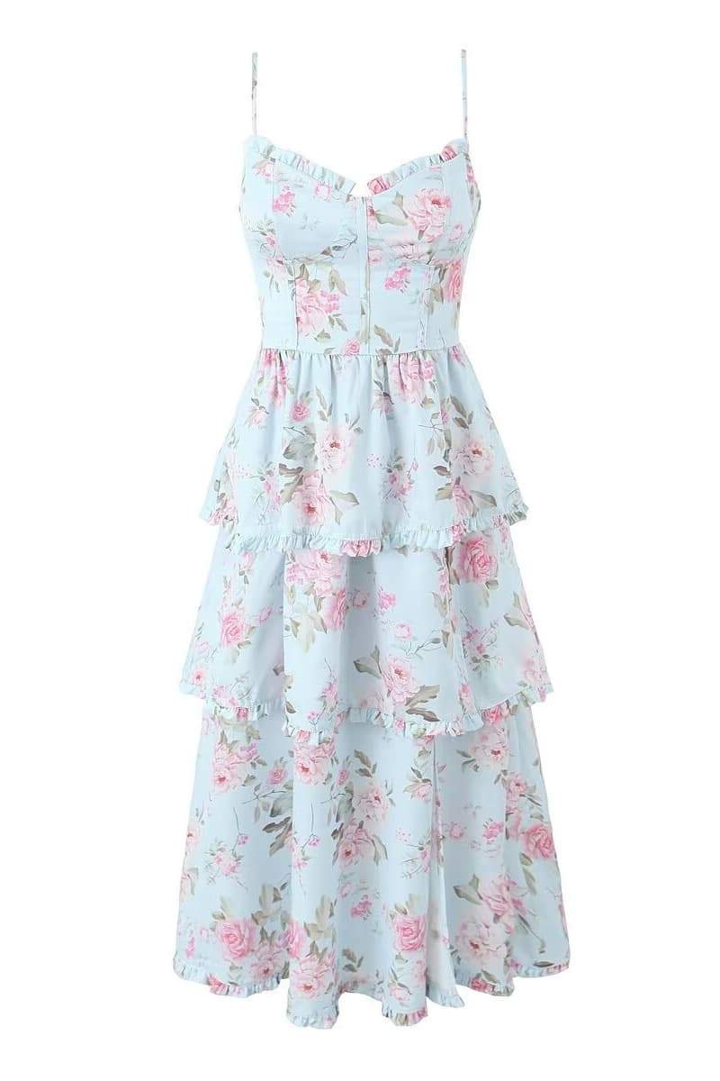 Vivian Çiçekli Fırfırlı Yırtmaçlı Midi Elbise