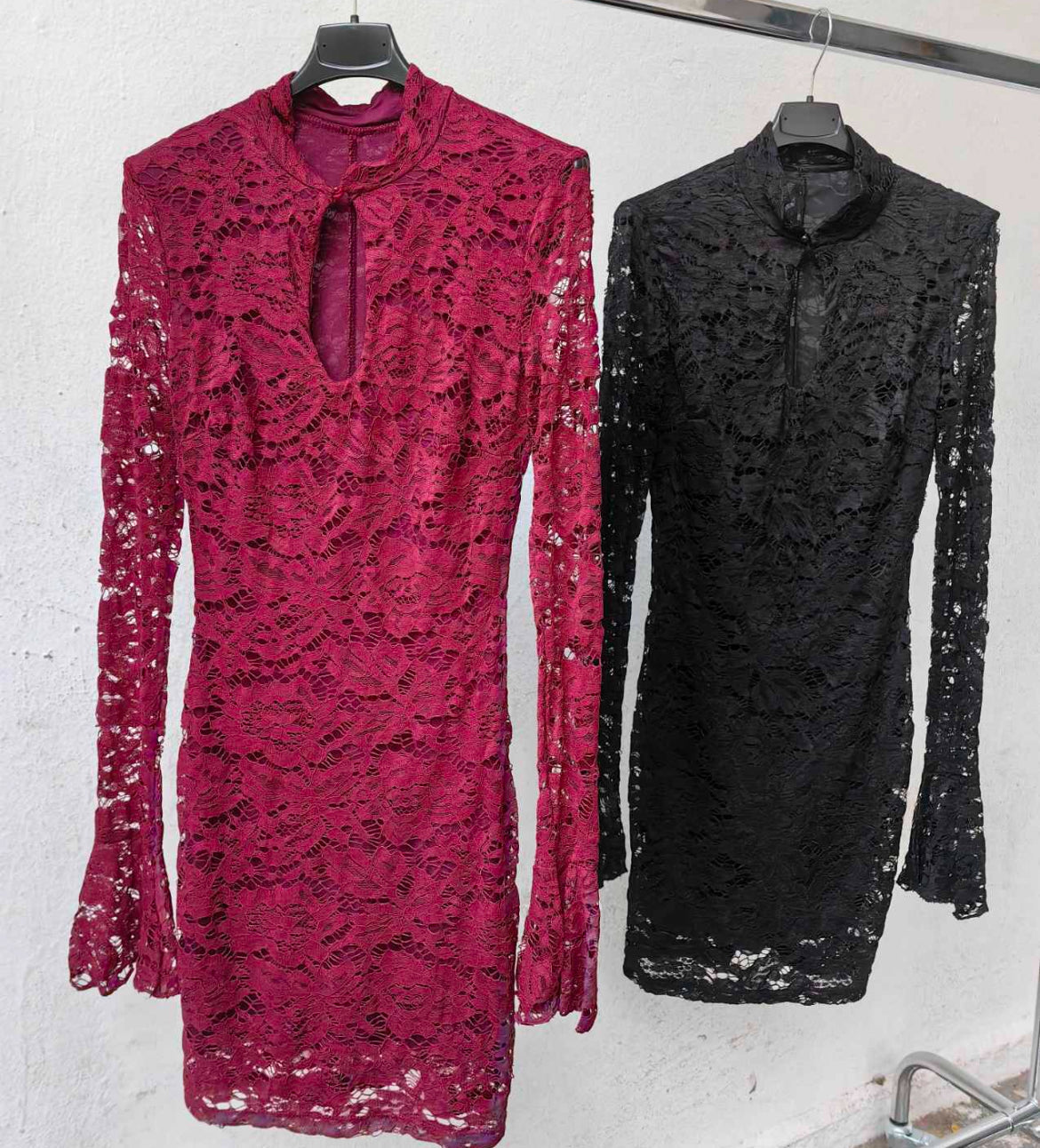 Göğüs kısmında yırtmaç bulunan, boyun kısmında düğme bulunan, dantel detaylı, uzun kollu mini elbise. İç astarı ve kollarında şeffaflık bulunmaktadır. Elastiktir.
