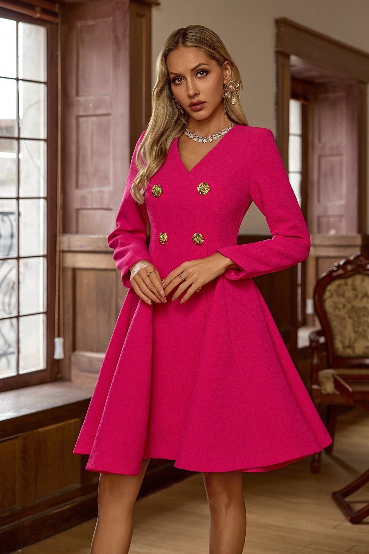 Peggie Uzun Kol Gül Kırmızı Mini Elbise