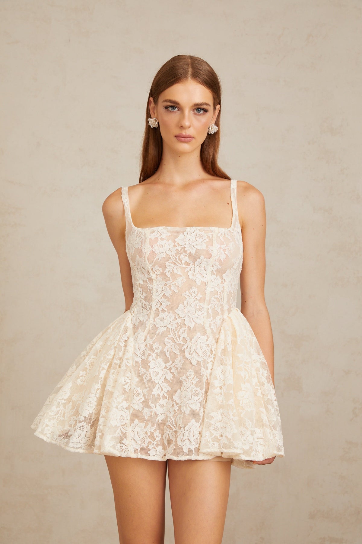 Euphemia Krem Beyaz Çiçekli Dantel Mini Elbise