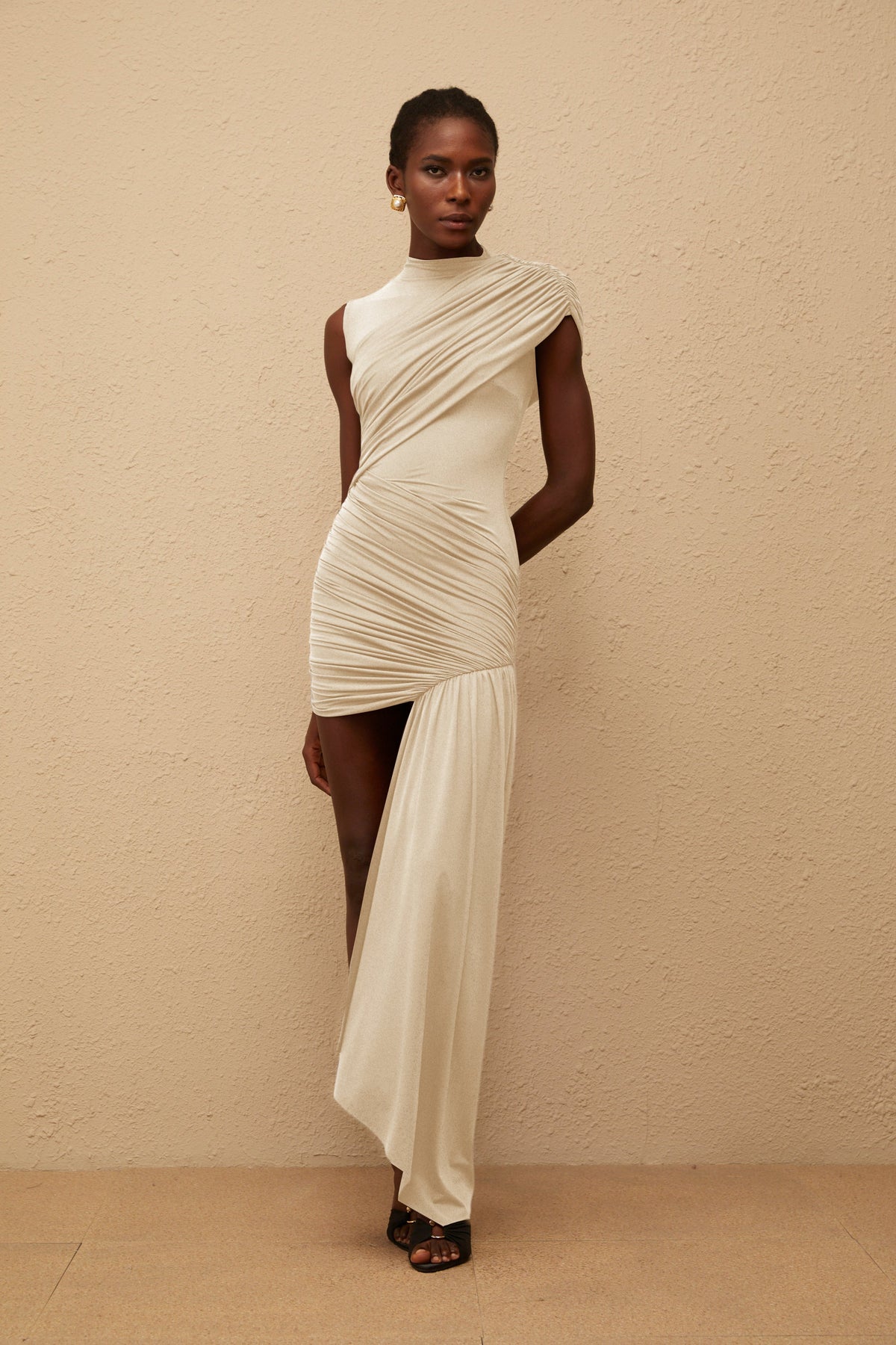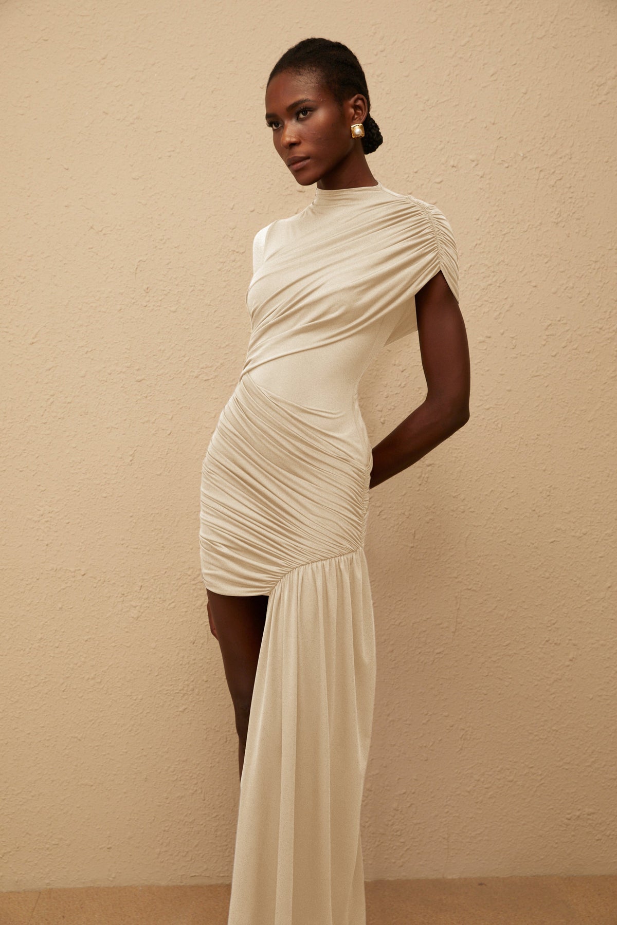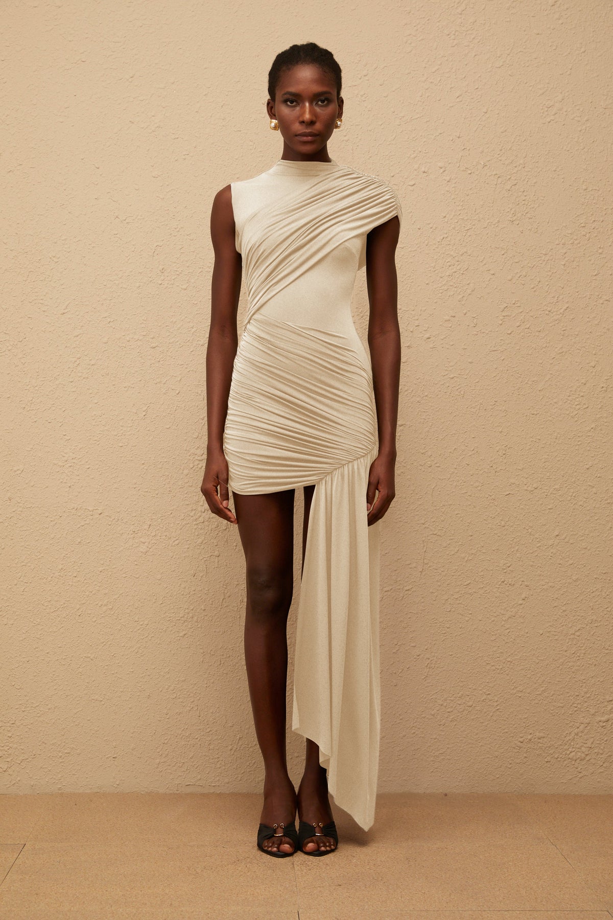 Fée Nötr Asimetrik Büzgülü Mini Elbise