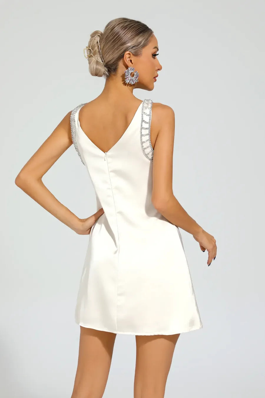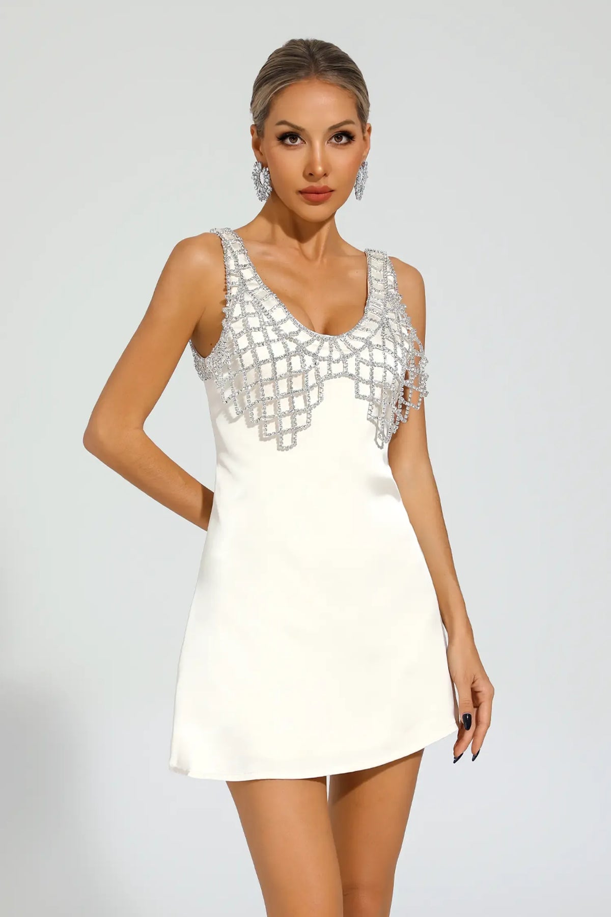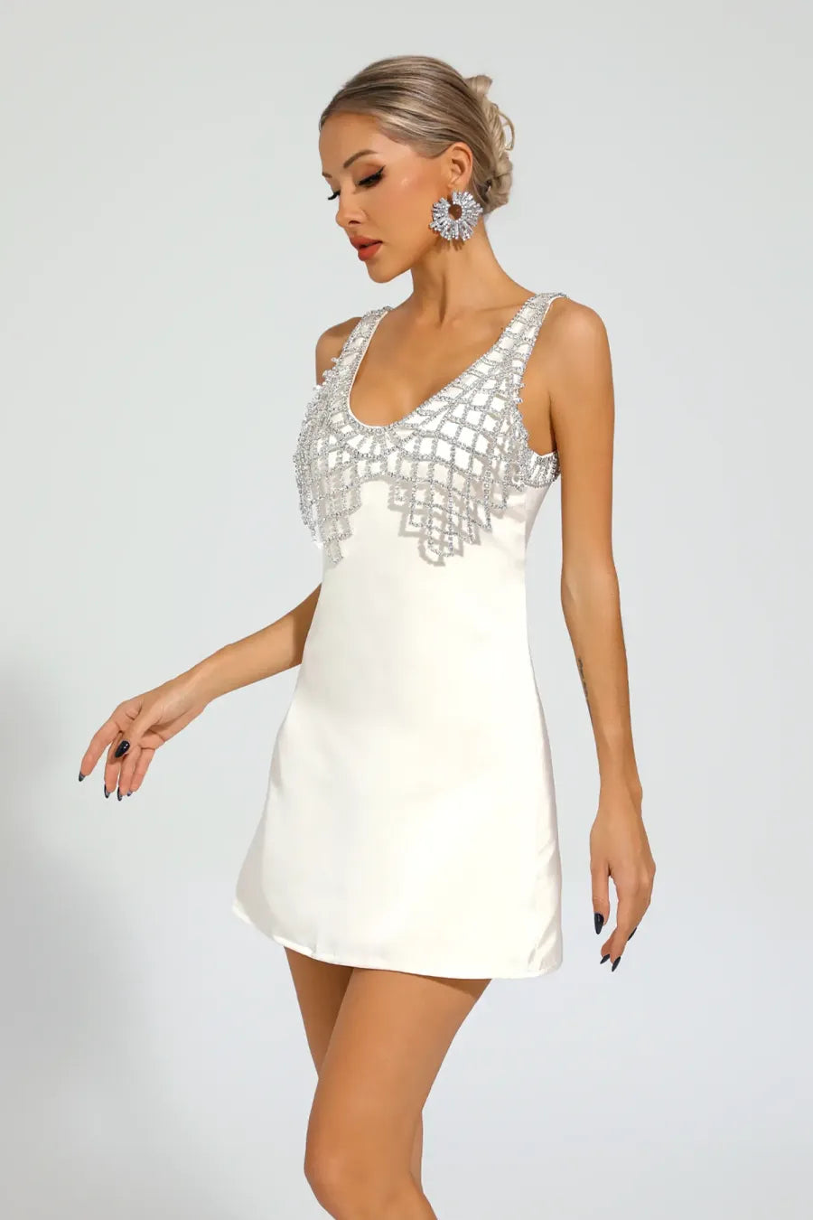 Hale Beyaz Taşlı Kolsuz Mini Elbise