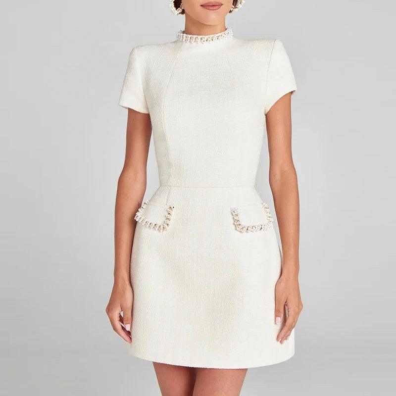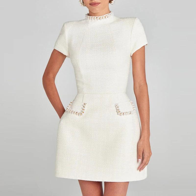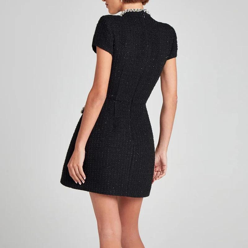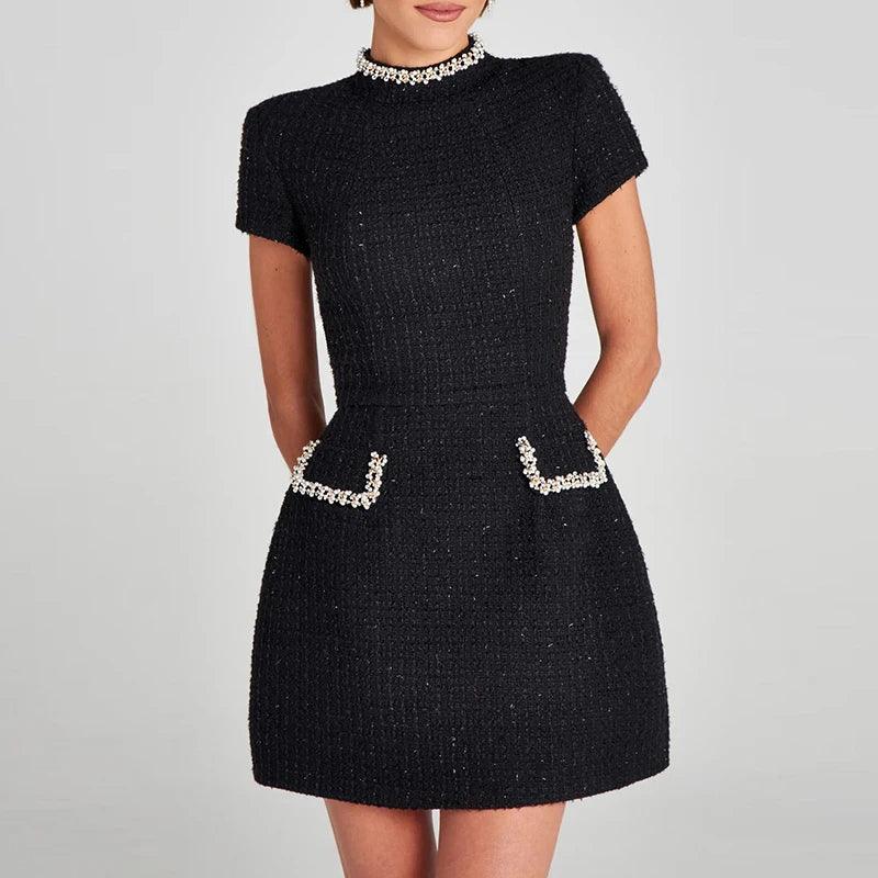 Gündüzden geceye şık bir görünüm için şık bir seçim olan bu siyah tüvit mini elbise ile zamansız bir sofistikelik sergileyin. Yapılandırılmış A kesim silüete ve kısa kollara sahip bu elbise, zarif bir şıklık sunuyor. Yakasındaki inci süslemeler ve cep vurgularıyla gardırobunuza klasik bir cazibe katar.
