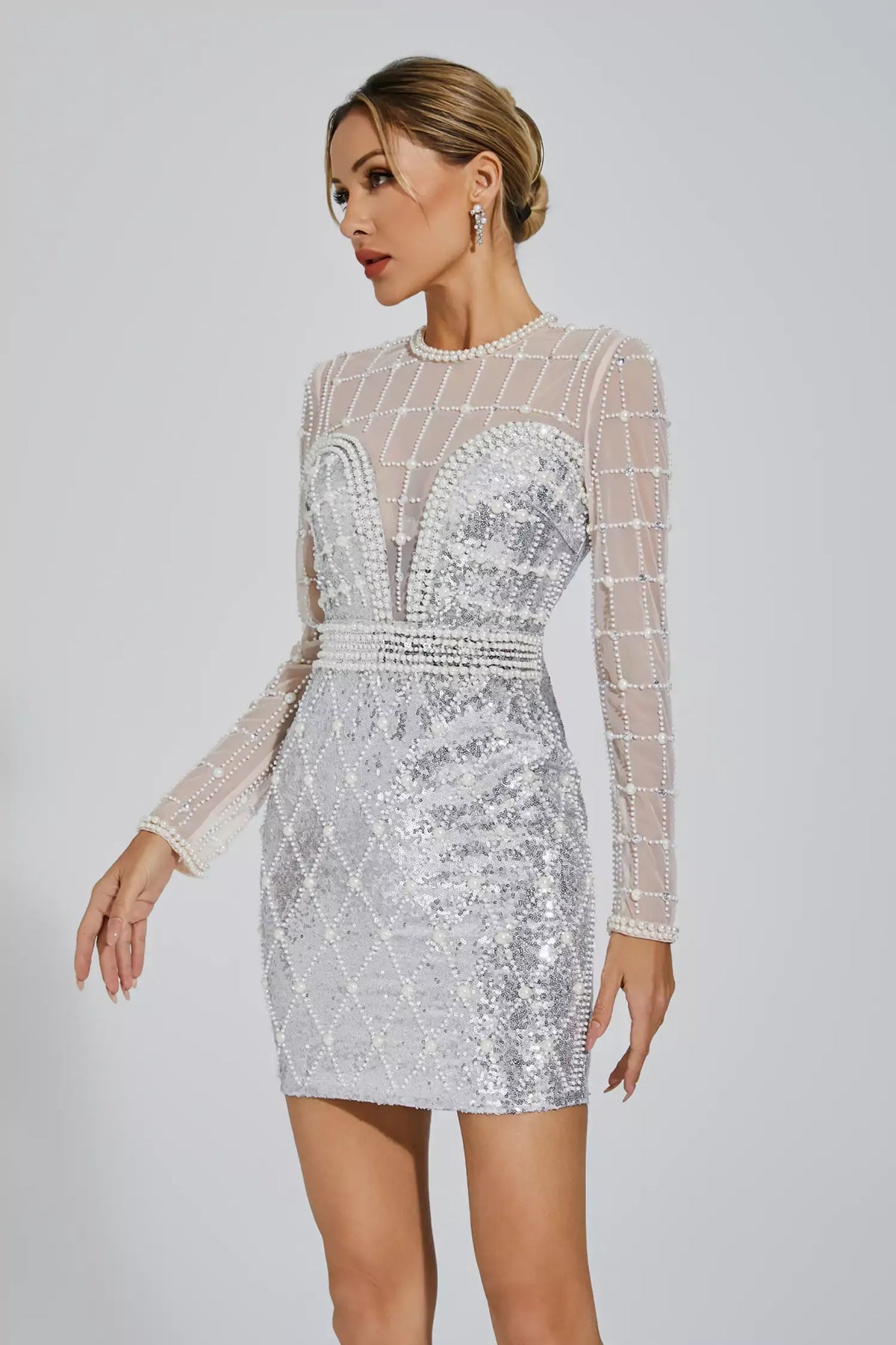 Iliana Gümüş İnci İşlemeli Payet Mini Elbise