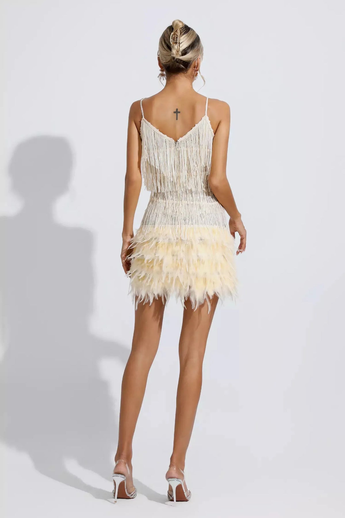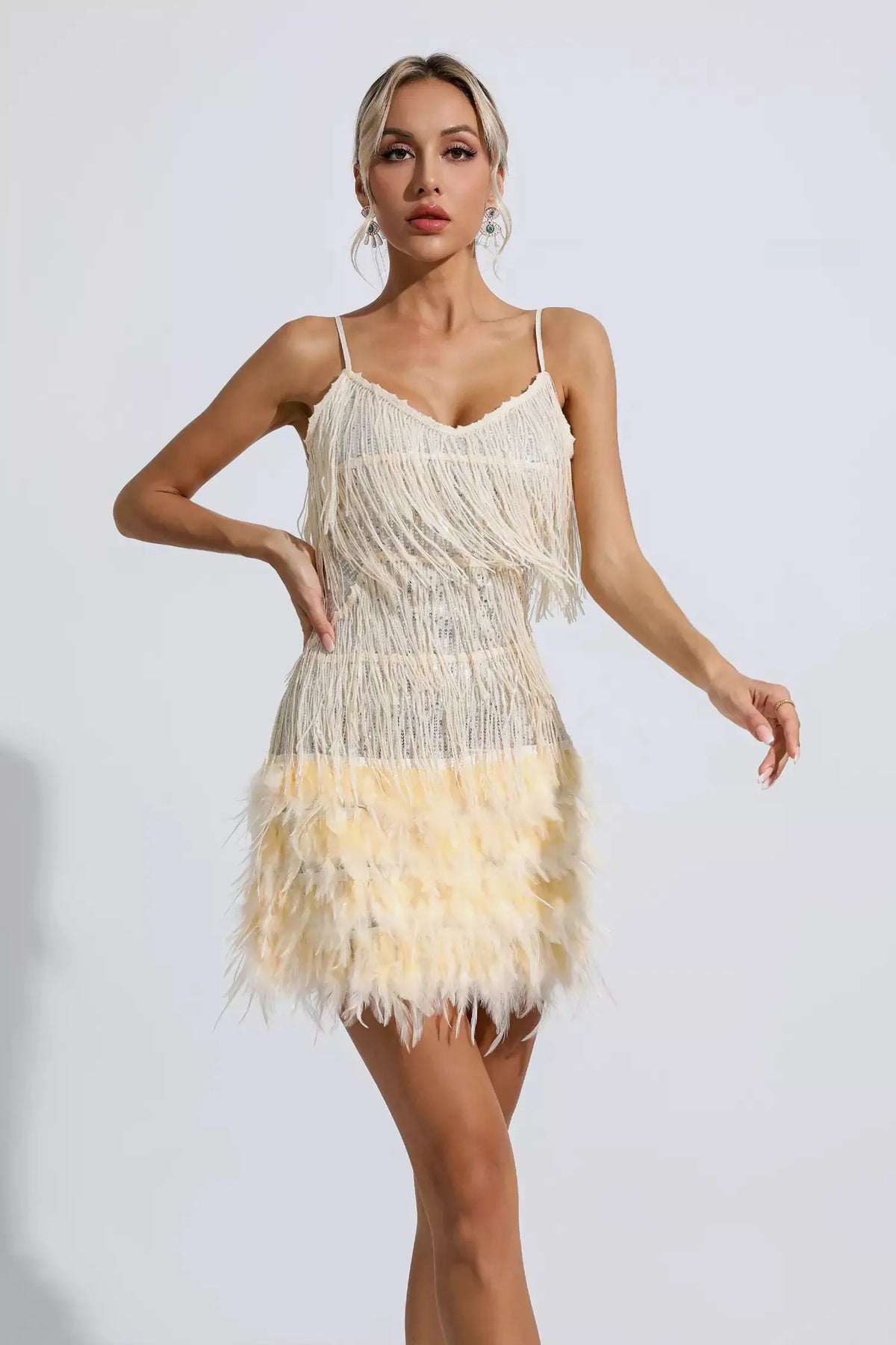 Lilliana Şampanya Tüy Püskül Payet Mini Elbise