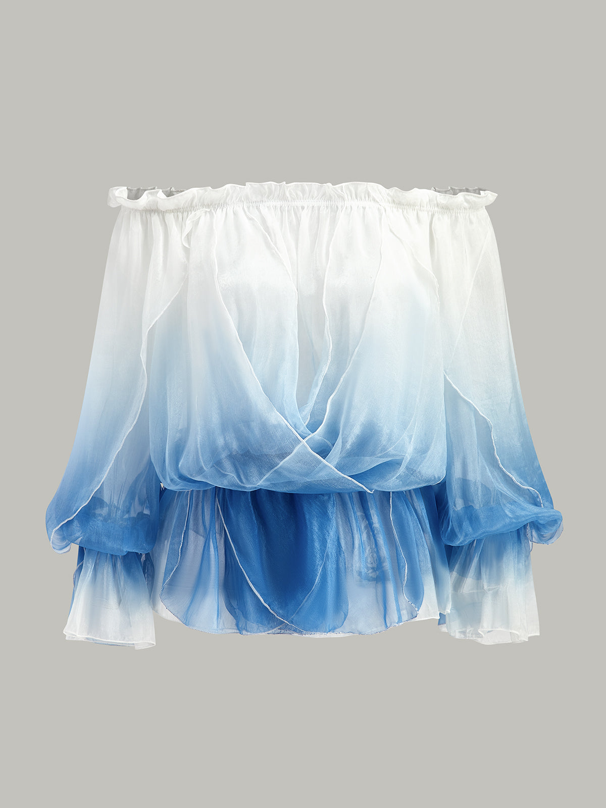 Yarı Şeffaf Degrade Çiçekli Omuzdan Askılı Şifon Üst