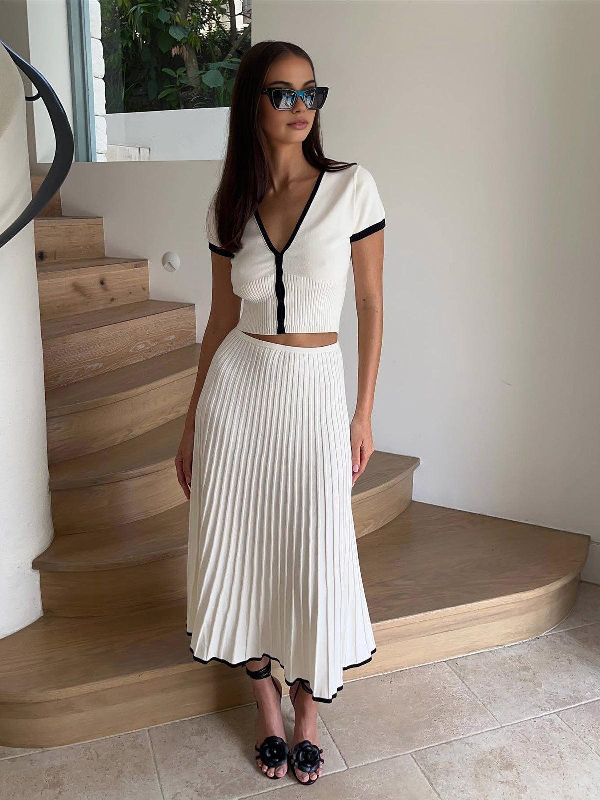 Şıklığı ve rahatlığı bir araya getiren bu beyaz triko takım, siyah detaylarıyla modern bir görünüm sunuyor. Hem günlük kullanım hem de şık etkinlikler için zarif bir tercih!