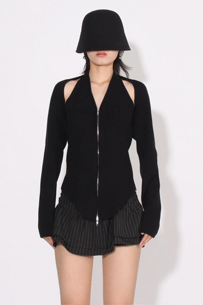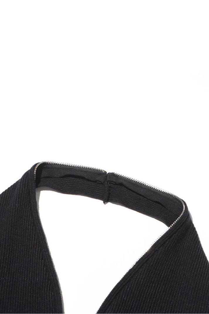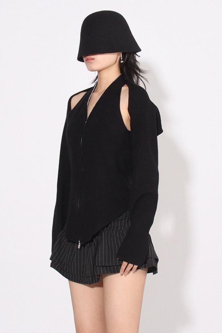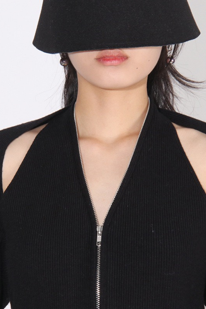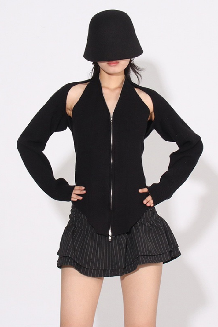 -Detaylar: Halter yaka atlet, uzun kollu hırka, boyundan aşağı inen zincir detay, çift yönlü fermuar kapama, etek ucu asimetrik kesim