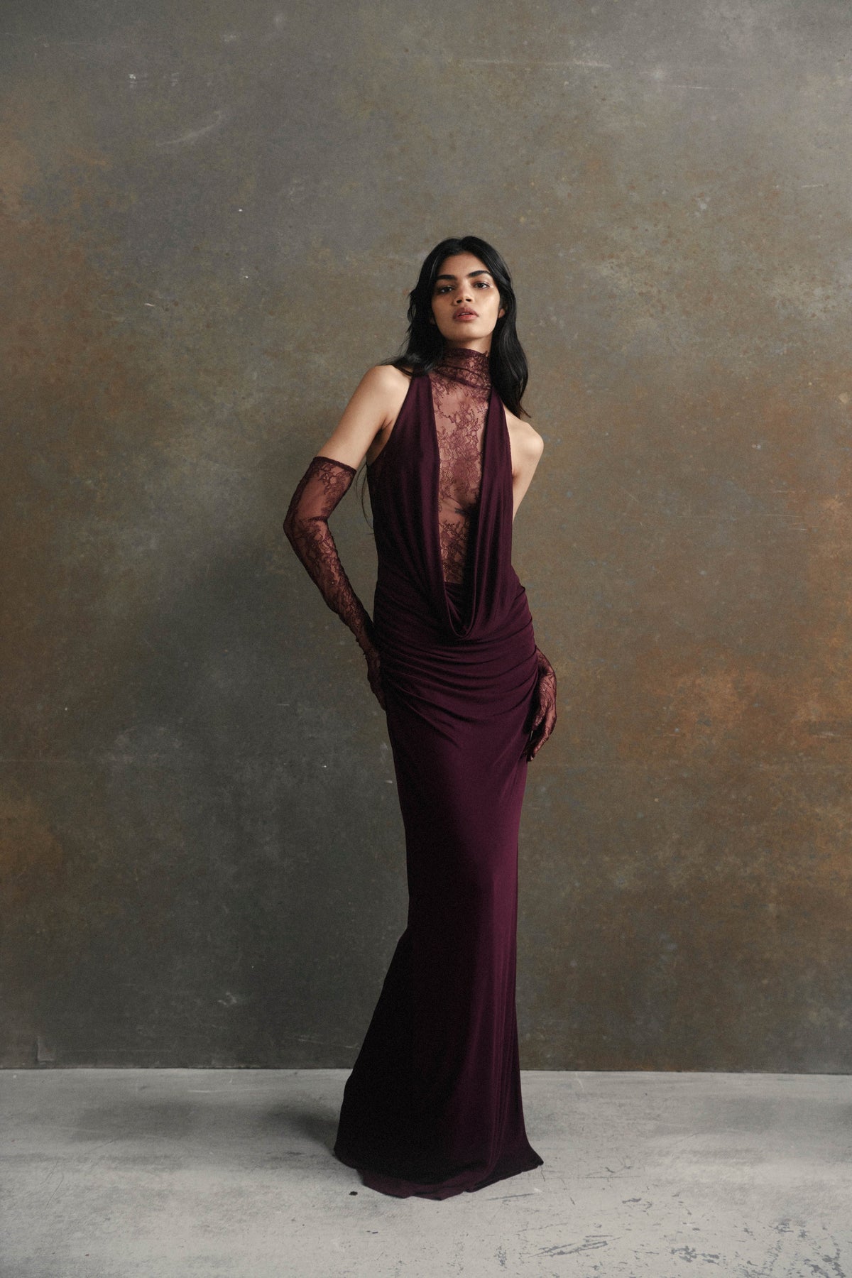 Adalyn Elbisesi, zamansız bir sofistikasyon ve duygusal bir cazibe sunuyor. Zengin derin bordo tonunda tasarlanan bu yere kadar uzanan elbise, akıcı ve drapeli bir siluete sahip.